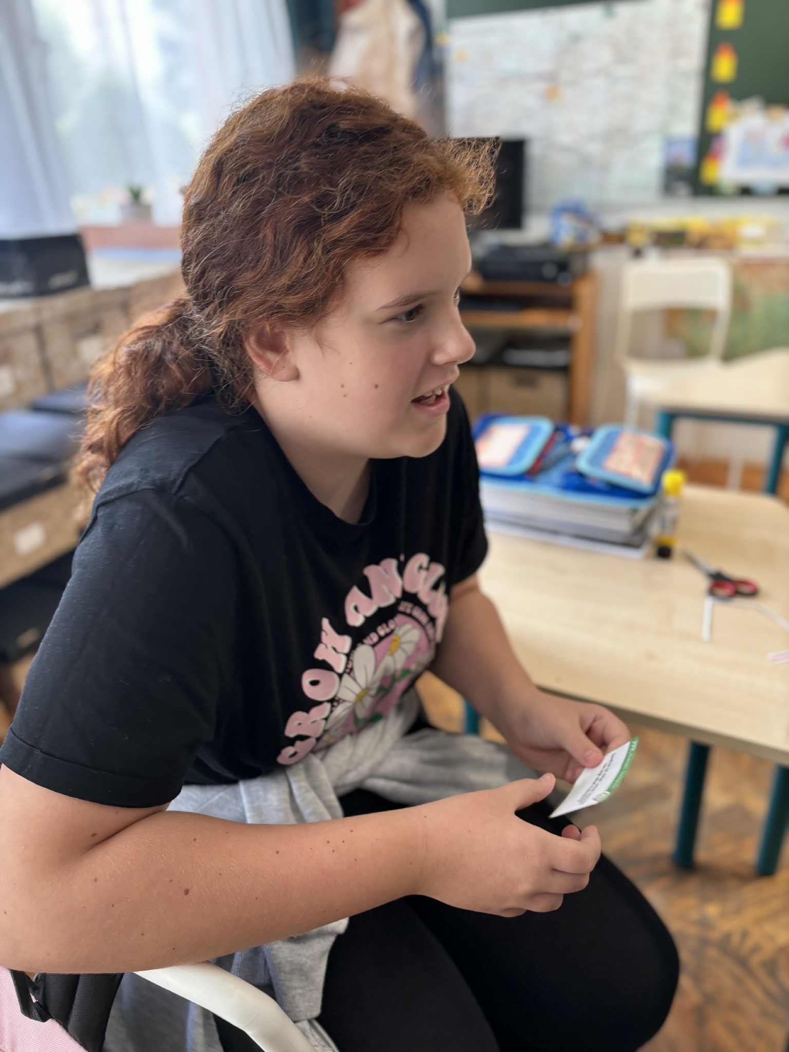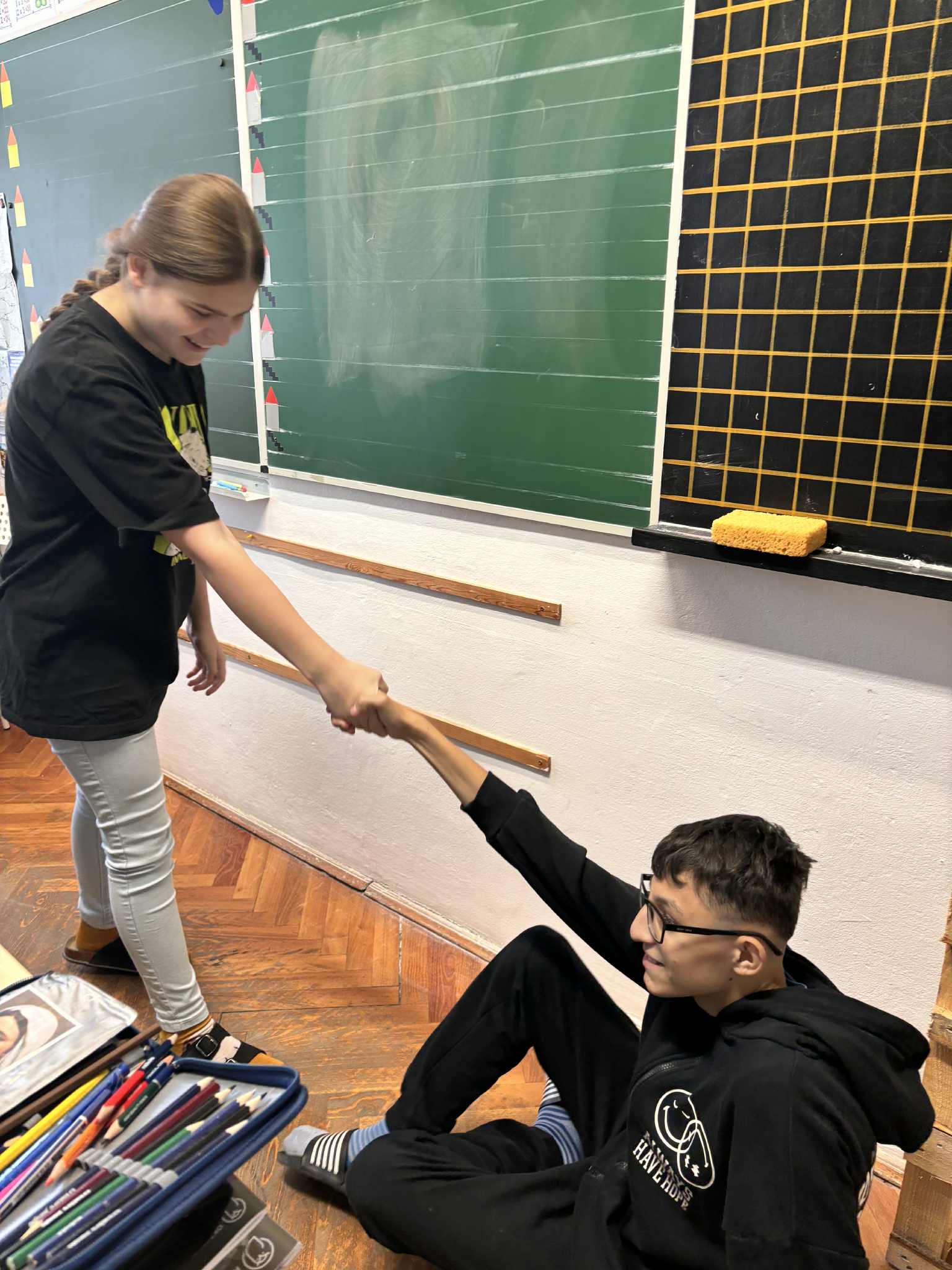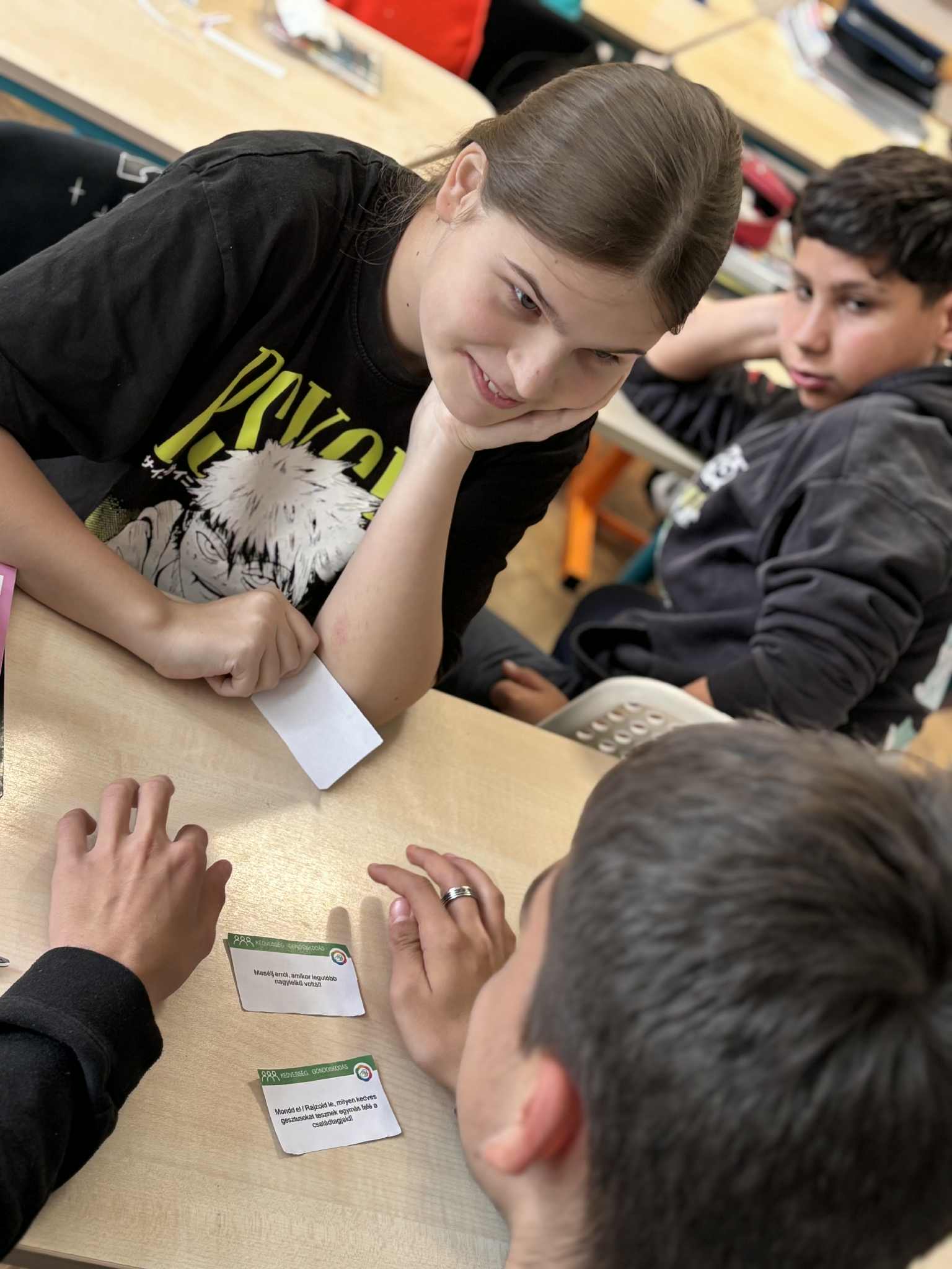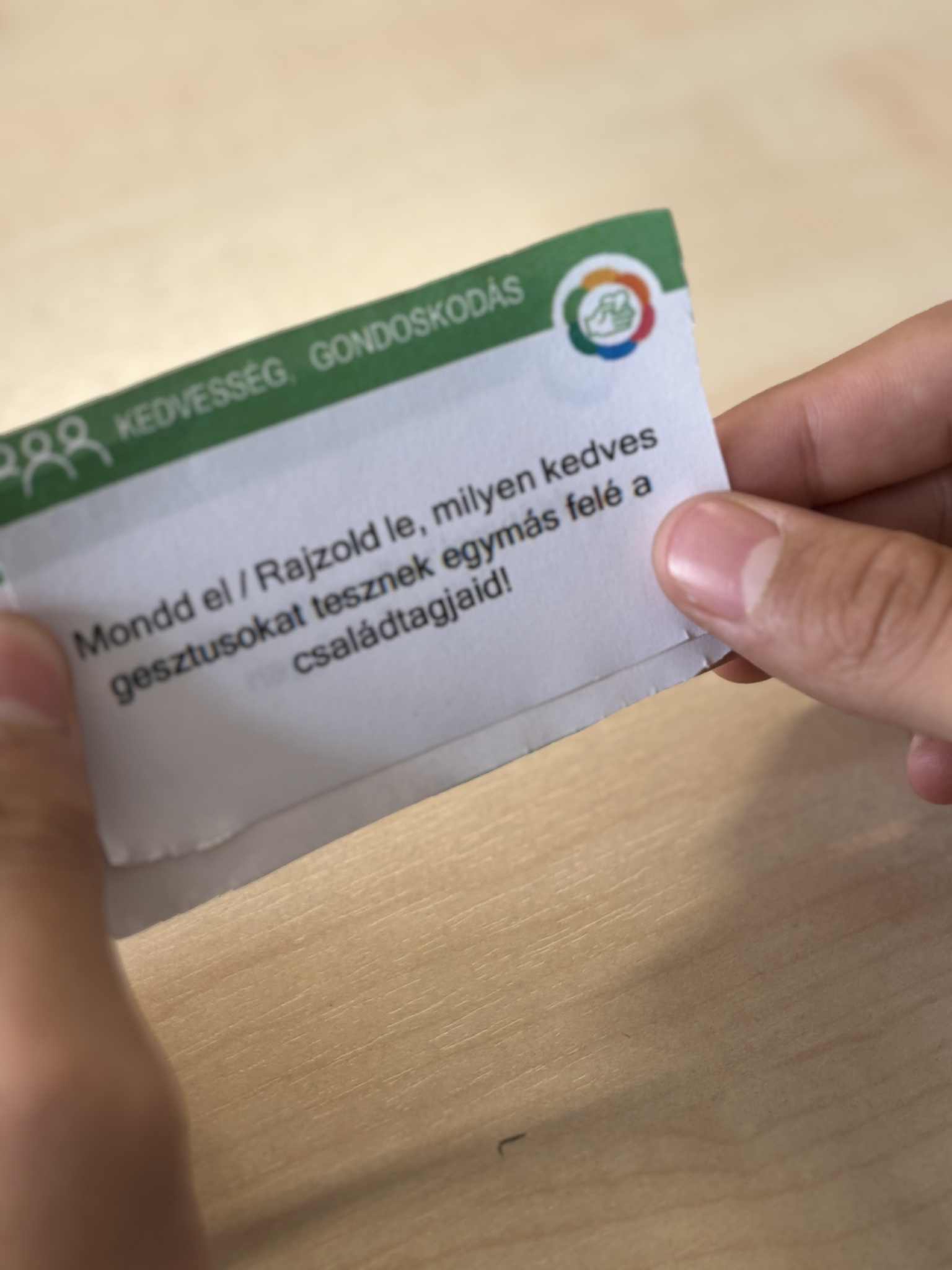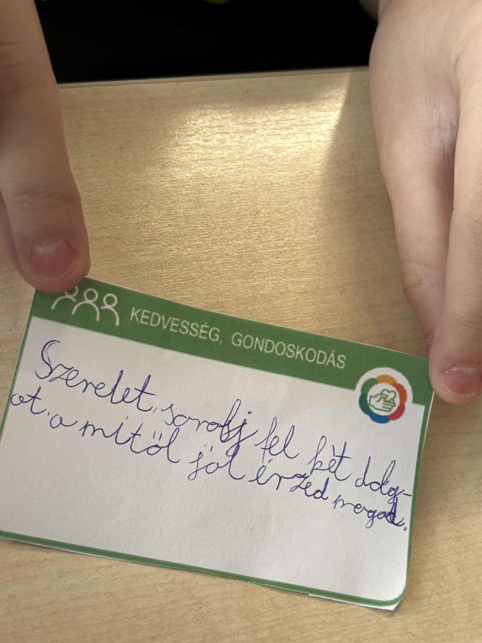A 6. osztály ebben a hónapban az ajánlott témák közül a kedvességgel foglalkozott. Megbeszéltük, hogy mikor tapasztaltak a társaiktól kedvességet, és ez hogy esett nekik. Eljátszották, lerajzolták, elmutogatták a kedvességük címerét. Majd az ajánlott kérdéskártyákkal dolgoztunk párokban. Volt arra is lehetőség, hogy készíthessenek kérdéseket egymásnak a párok. Nagyon kedves, és érdekes kérdéseket készítettek, meglepve ezzel a párjaikat.