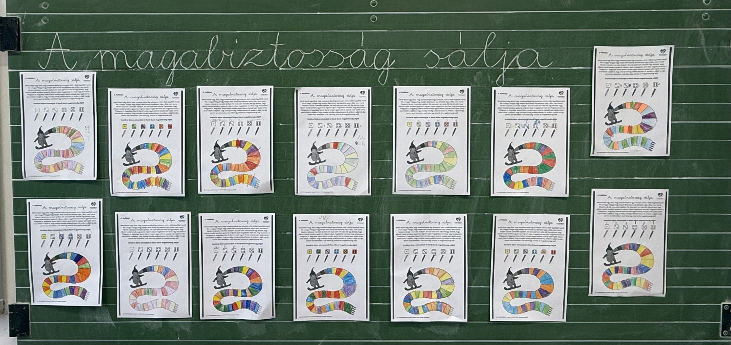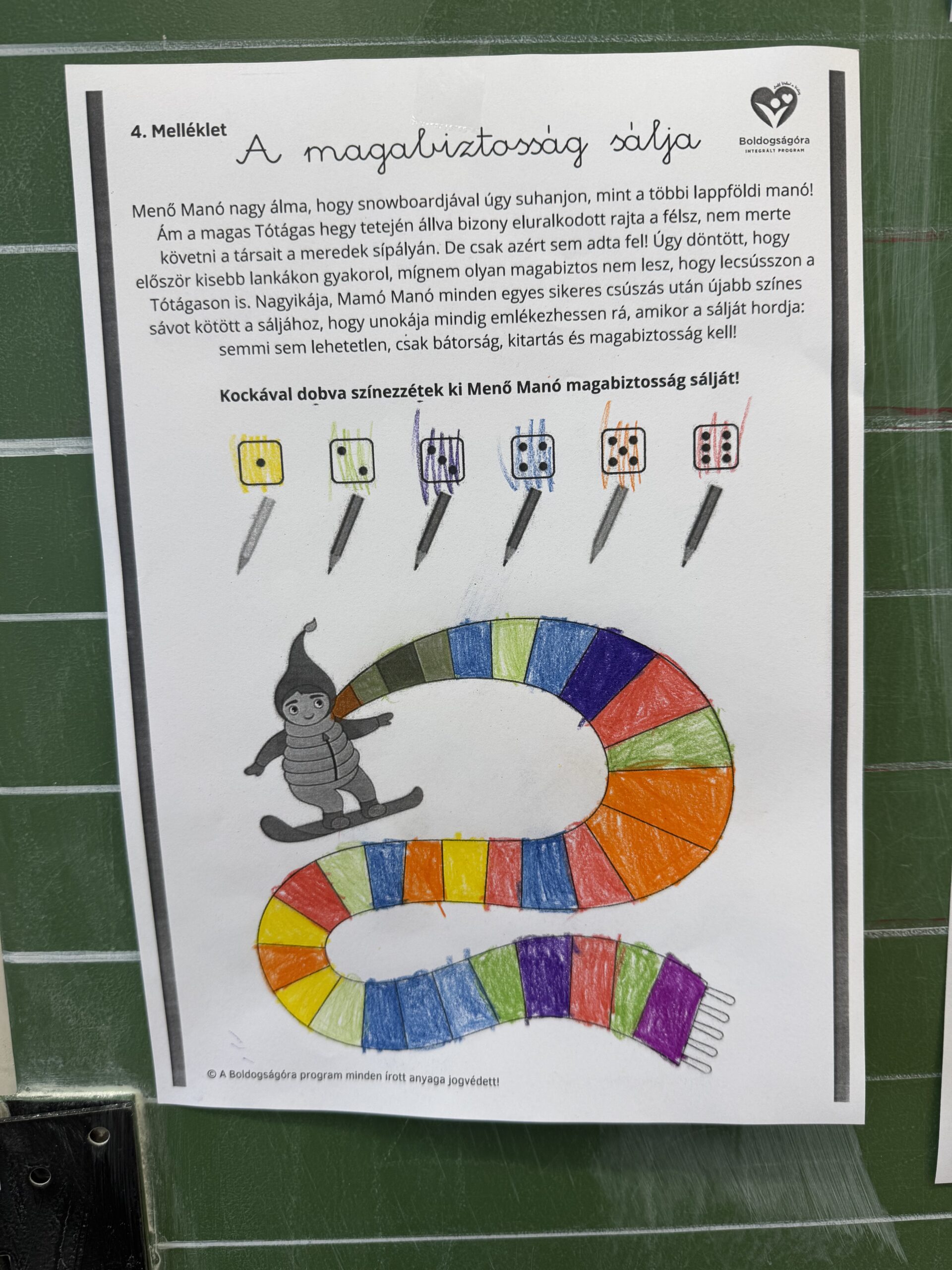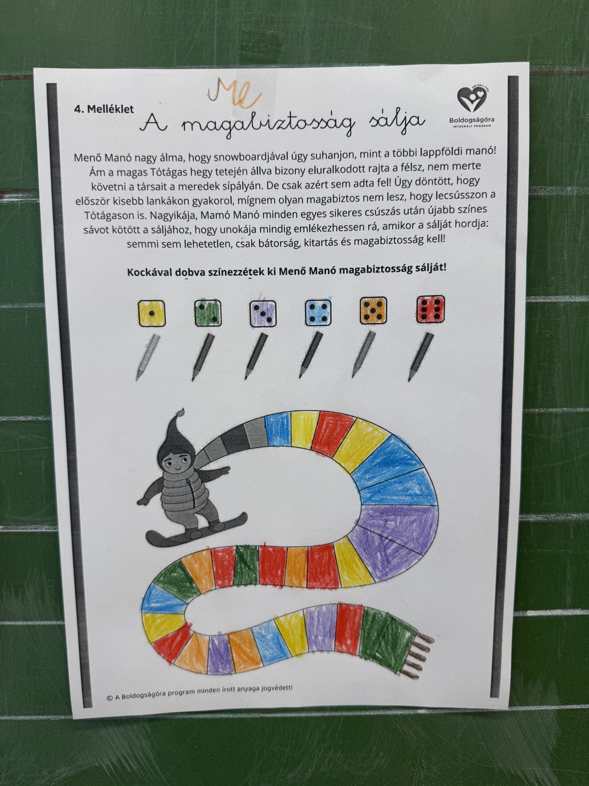 Menő Manó nagy álmát valósították meg a gyerekek a boldogság óra keretein belül, hiszen mindenki kiszínezte a magabiztosság sálját, ezzel segítve őt, hogy követhesse társait a meredek sípályán.