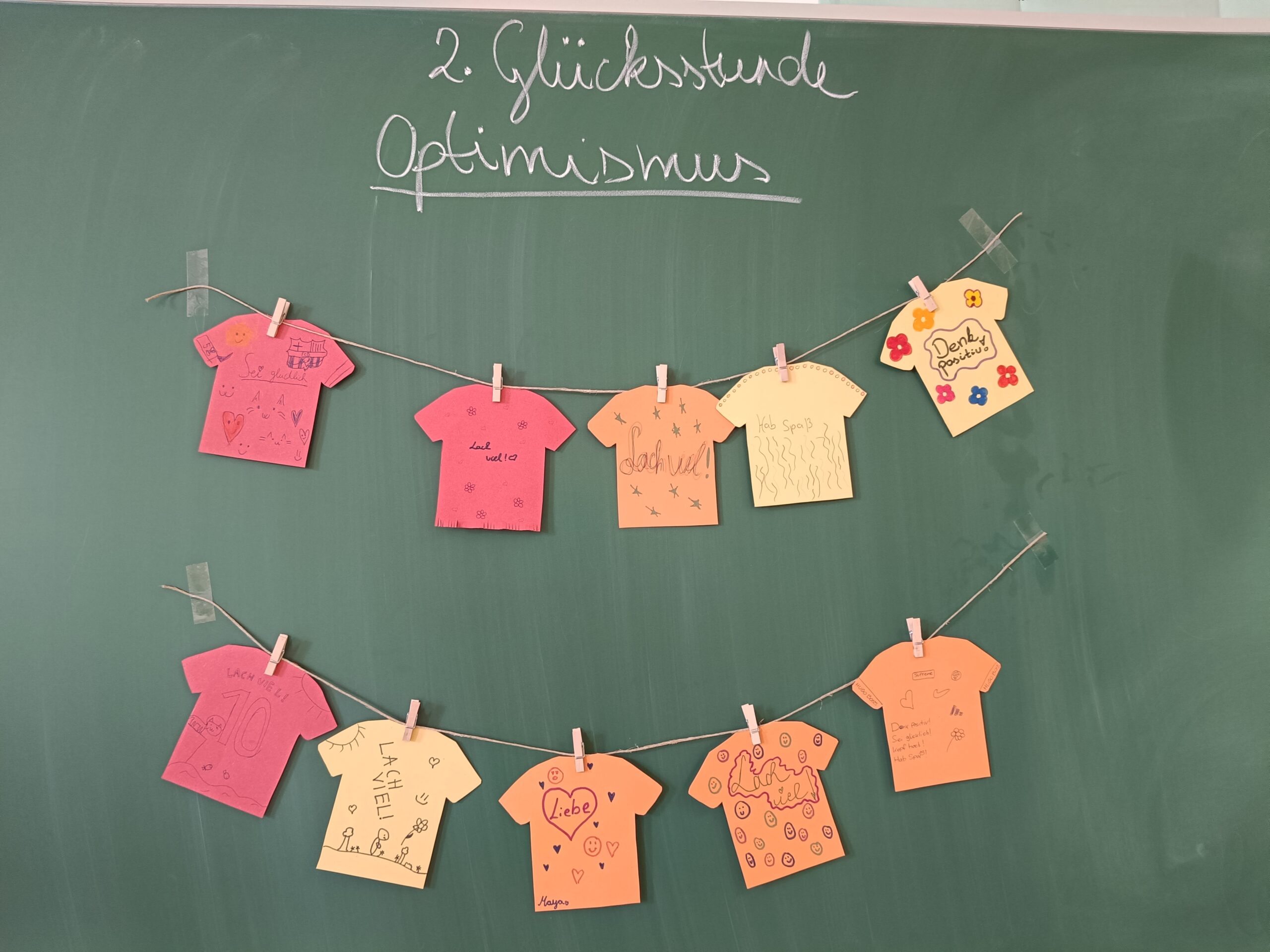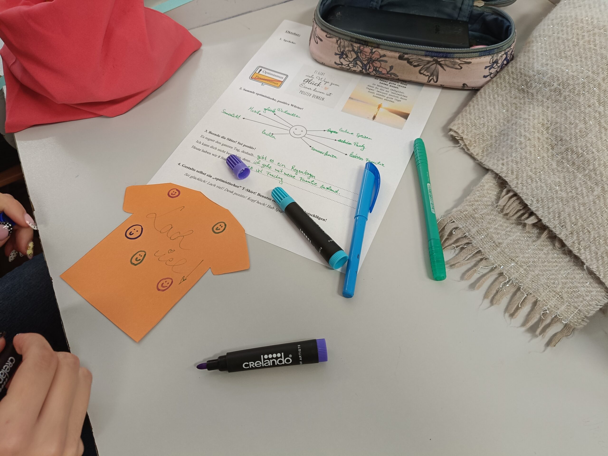 A második boldogságóránk témája „Az optimizmus gyakorlása” volt, amit a 11.F-es csoportommal német órán dolgoztunk fel. Miután egy szórejtvény segítségével megfejtették az óra témáját („Optimismus”), közösen felolvastunk és lefordítottunk néhány idézetet a pozitív gondolkodásról. Az óra további részében a tanulók pármunkában optimista/pozitív szavakat gyűjtöttek, majd néhány mondatot kellett pozitívan befejezniük (pl.: Ma 8 órám van, de…). Végezetül mindenki megalkotta a saját tervezésű optimista pólóját. Minden pólóra rákerült egy-egy bátorító mondat németül (pl.: Fel a fejjel! Gondolkodj pozitívan!).