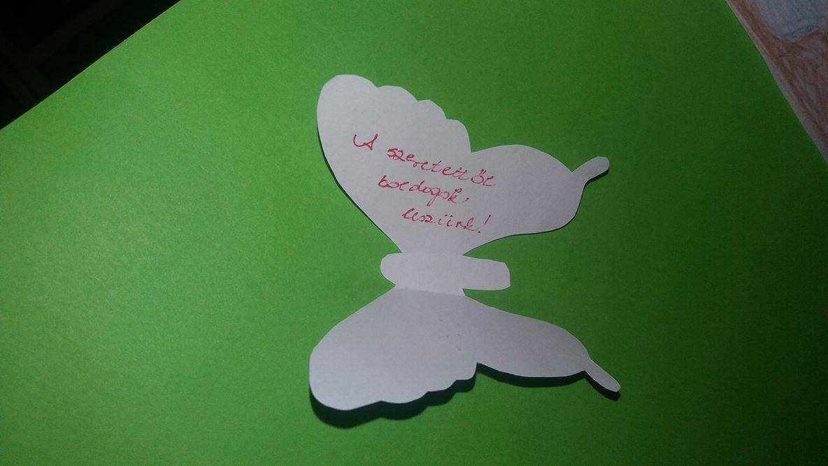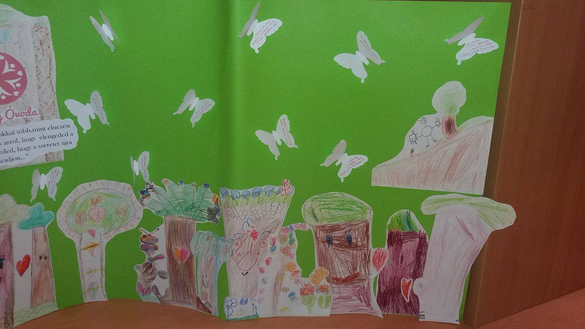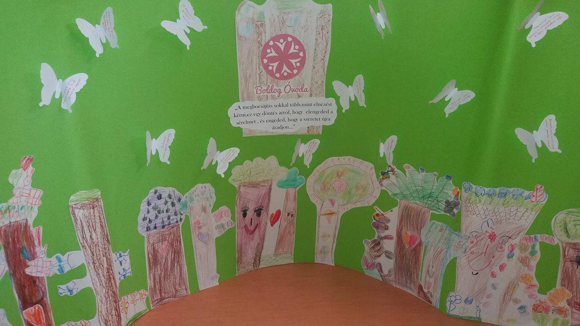 Hónapunk a megbocsátás feldolgozásával telt el. Rengeteg hozzászólással, megbeszéléssel, tapasztalattal és szituáció felelevenítésével, kérdezz-felelek-kel alaposan körbejártuk a témát. Szóba kerültek családtagok, barátok, pajtások, a velük kapcsolatos esetek és orvoslásuk. Megvitattuk a havi mesét, nagyon jó meglátások, „kommentek” érkeztek már a mese közben is a kis vaddisznóval és osztálytáraival kapcsolatban, a helyes és helytelen cselekedetek, tulajdonságok kapcsán. Megosztották gondolataikat ők mikor érezték megbántva magukat, milyen alkalomra emlékeznek, amikor ők kértek bocsánatot és hogyan történt ezek orvoslása. A legtöbbször a boldogság, a szeretet, a barátság, a békesség hangzott el, a szomorúság, gonoszság, fájdalom, rossz, bántás is szóba került. Végül a havi feladatként mindenkit elvarázsoltam a MEGBOCSÁTÁS ERDEJÉBE, és kis facsemetékké változtunk. A gyermekek mind egy-egy megbocsátáshoz vezető tulajdonsággal rendelkező fát képviseltek az erdőben, elmondták, hogy miért is fontosak ezek. A képeken az általuk készített fákból született erdő és a tulajdonságot, azok fontosságát leíró kis pillangók láthatóak. Az erdőben megtalálható többek között a szeretet, az öröm, az ölelés, a boldogság, a békesség, a barátság, a szerelem fája egyaránt. A legtöbb gyermek a szeretet fájának nevezte el művét. Az általuk elhangzott néhány gondolatot ide is leírom: