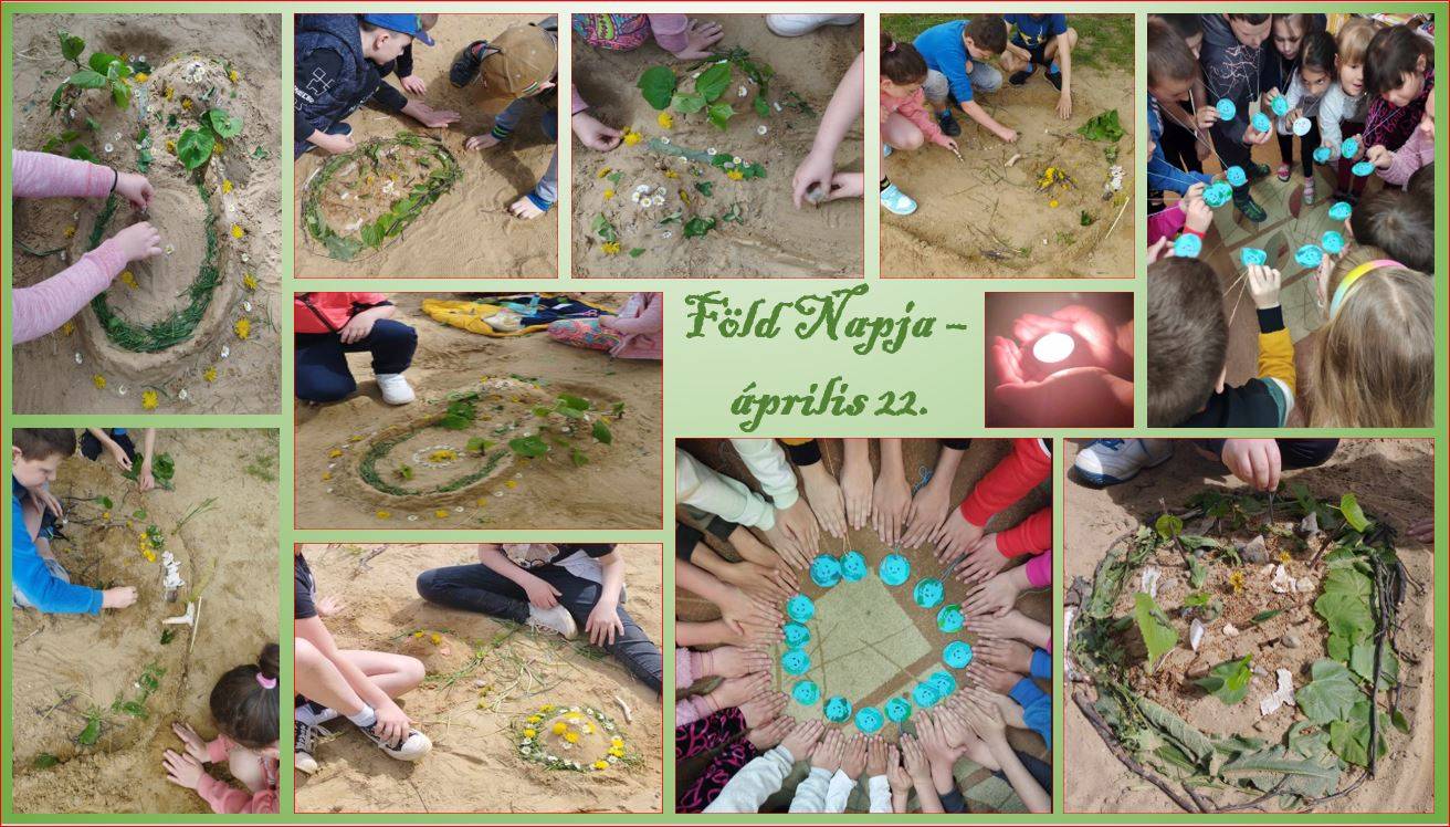 Legérdekesebb, leglátványosabb és legfőbb, bár nem maradandó munkadarabjaink azonban az iskola udvarán a Föld Napja alkalmából készített „LANDART” típusú alkotások lettek. Amit találtunk, abból építettünk: kavicsokból, virágokból, ágakból, levelekből, fűszálakból, földből és homokból. Hegyek, völgyek, síkbeli képek, mandalák készültek teljes egyetértésben, vidáman, elmélyülten, relaxált állapotot eredményezve. Ebben a hangulatban hallgattuk meg Bagdi Bella Gyújts egy gyertyát a Földért című dalát is a tanteremben. Közös döntéssel elhatároztuk, hogy aznap este 19:00 órakor, otthon, mindannyian gyújtunk egy mécsest vagy gyertyát és a családjainkkal együtt is megünnepeljük a Föld Napját. Ez az elhatározás nagyon jól sikerült, többen is elküldték a gyertyás fotójukat számomra. Sablon alapján egy medált is készítettünk, amit fonalra kötve egész héten viseltünk a nyakunkban, hiszen Földünkre minden nap vigyáznunk kell, épsége megőrzéséért felelősséggel tartozunk!