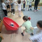 Elsőként a programban ajánlott „Bevezető játékot” játszottuk el. Miután mindenki átöltözött a következő motivációval invitáltam a gyerekeket a tornaszobához:
