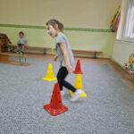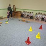 A tornaszobához érve egy fekete kendőt találtunk, amit a boszorkány hagyott el. Majd a „varázserdőbe” belépve láthatták, hogy mindenféle akadályokat varázsolt eléjük a vasorrú. Egy gyors bemelegítést és járás-futás gyakorlatokat követően kezdődhetett az akadályokon való átjutás. Volt egyensúlyozó járás,- hogy a patakba bele ne essenek, köveken átlépés, szakadék fölötti függőhídon keresztül jutás, majd végül az erdő fáit szimbolizáló bójákat megkerülve érték el a célt,(vagyis azt a csodafőzetet, amitől bátrabbak és ügyesebbek lesznek, mint előtte.) De ahhoz, hogy csodafőzet elkészüljön, mindenkinek bele kellet dobálnia a hozzávalókat a boszorkány üstjébe (célba dobás babzsákkal.) A mozgás tevékenység befejezéseként játszottunk egy témához kapcsolódó játékot, majd levezetésként légzőgyakorlatokat végeztünk.