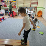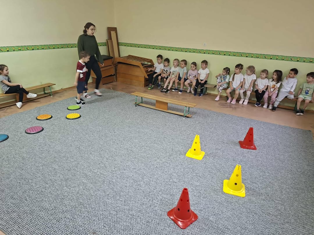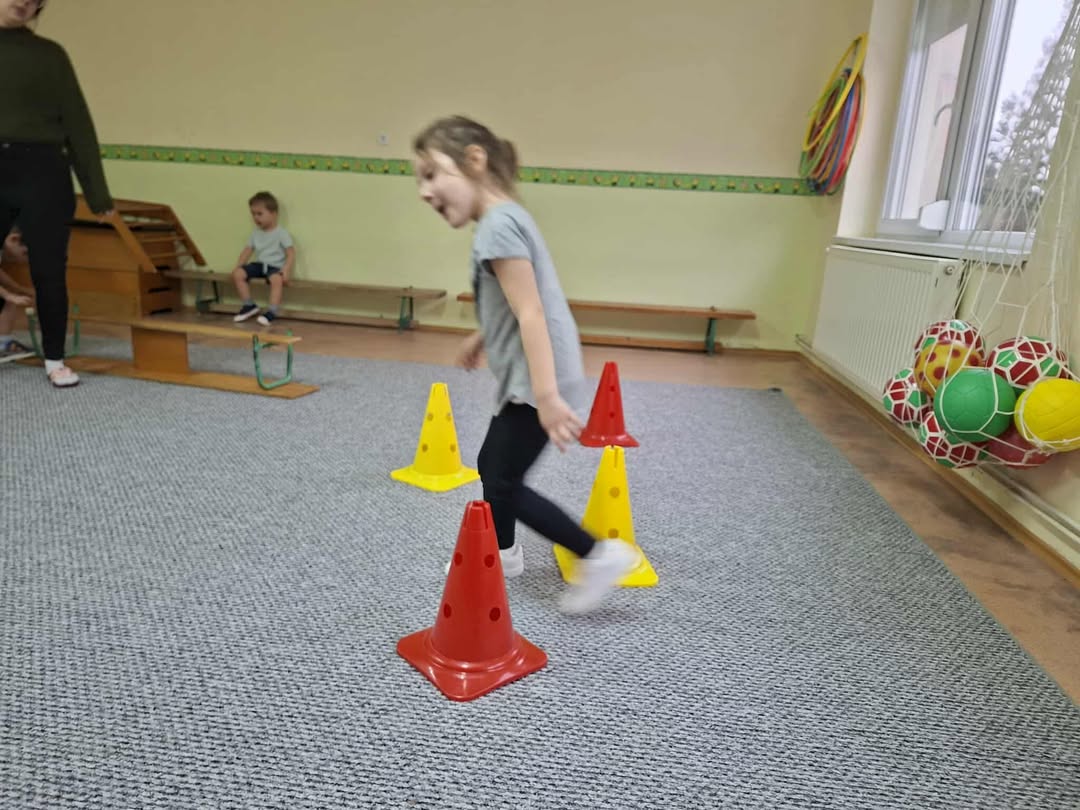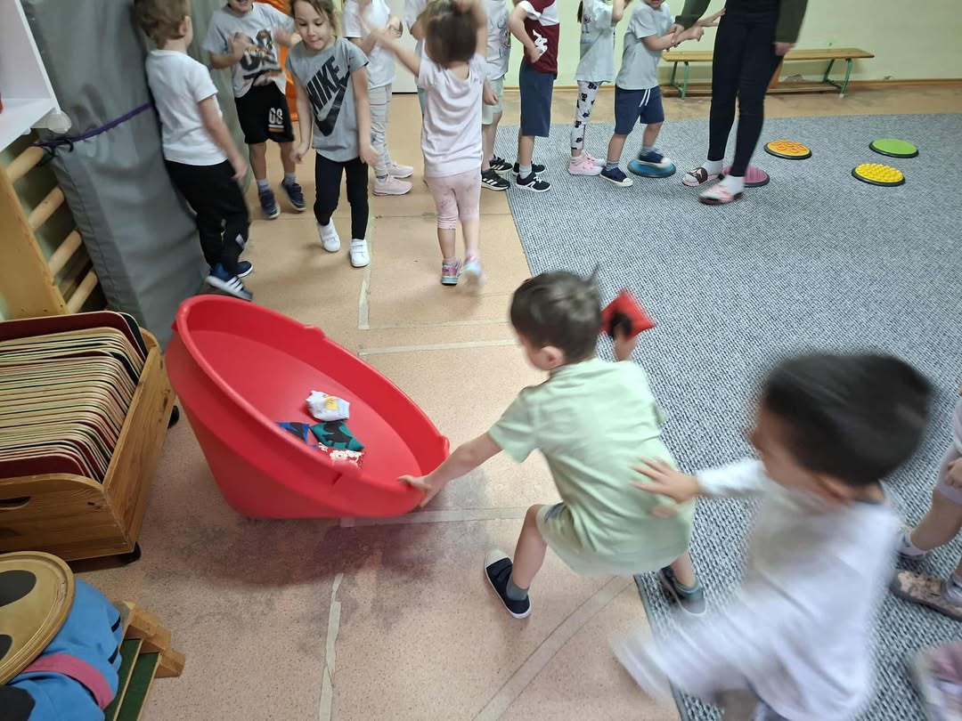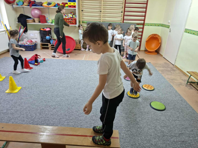 A tornaszobához érve egy fekete kendőt találtunk, amit a boszorkány hagyott el. Majd a „varázserdőbe” belépve láthatták, hogy mindenféle akadályokat varázsolt eléjük a vasorrú. Egy gyors bemelegítést és járás-futás gyakorlatokat követően kezdődhetett az akadályokon való átjutás. Volt egyensúlyozó járás,- hogy a patakba bele ne essenek, köveken átlépés, szakadék fölötti függőhídon keresztül jutás, majd végül az erdő fáit szimbolizáló bójákat megkerülve érték el a célt,(vagyis azt a csodafőzetet, amitől bátrabbak és ügyesebbek lesznek, mint előtte.) De ahhoz, hogy csodafőzet elkészüljön, mindenkinek bele kellet dobálnia a hozzávalókat a boszorkány üstjébe (célba dobás babzsákkal.) A mozgás tevékenység befejezéseként játszottunk egy témához kapcsolódó játékot, majd levezetésként légzőgyakorlatokat végeztünk.
