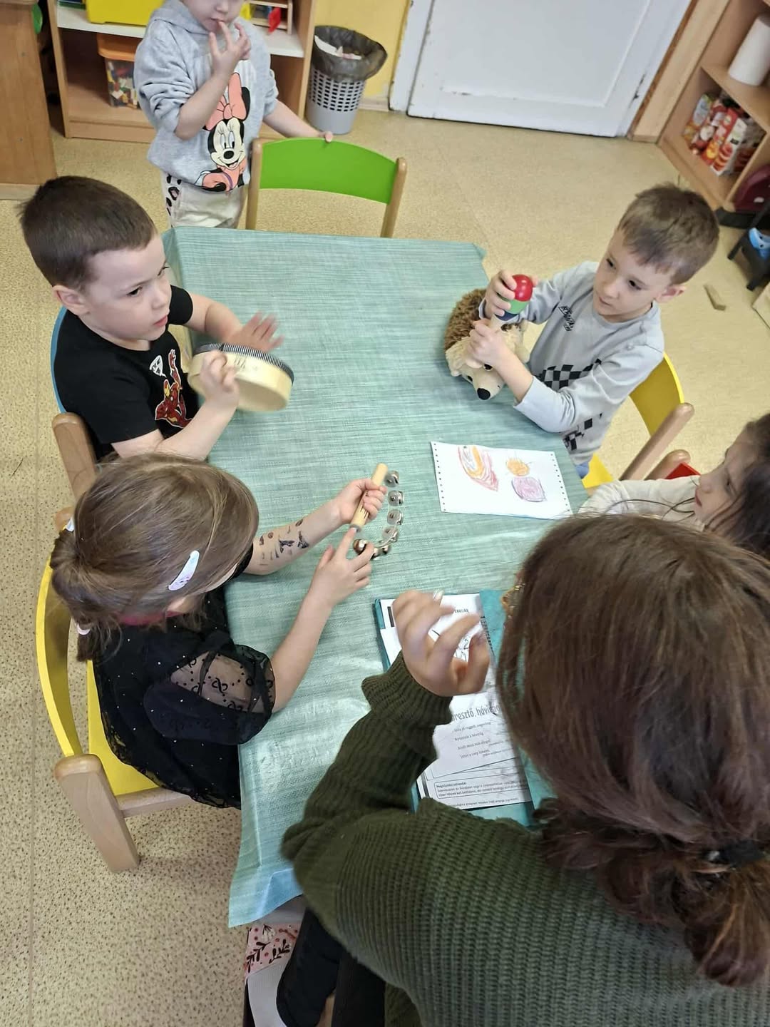 A nyelvtörők után különböző hangszereket osztottam ki, és azokkal gyakoroltuk az egyenletes lüktetést a héten tanult hóvirágos mondókánkra.