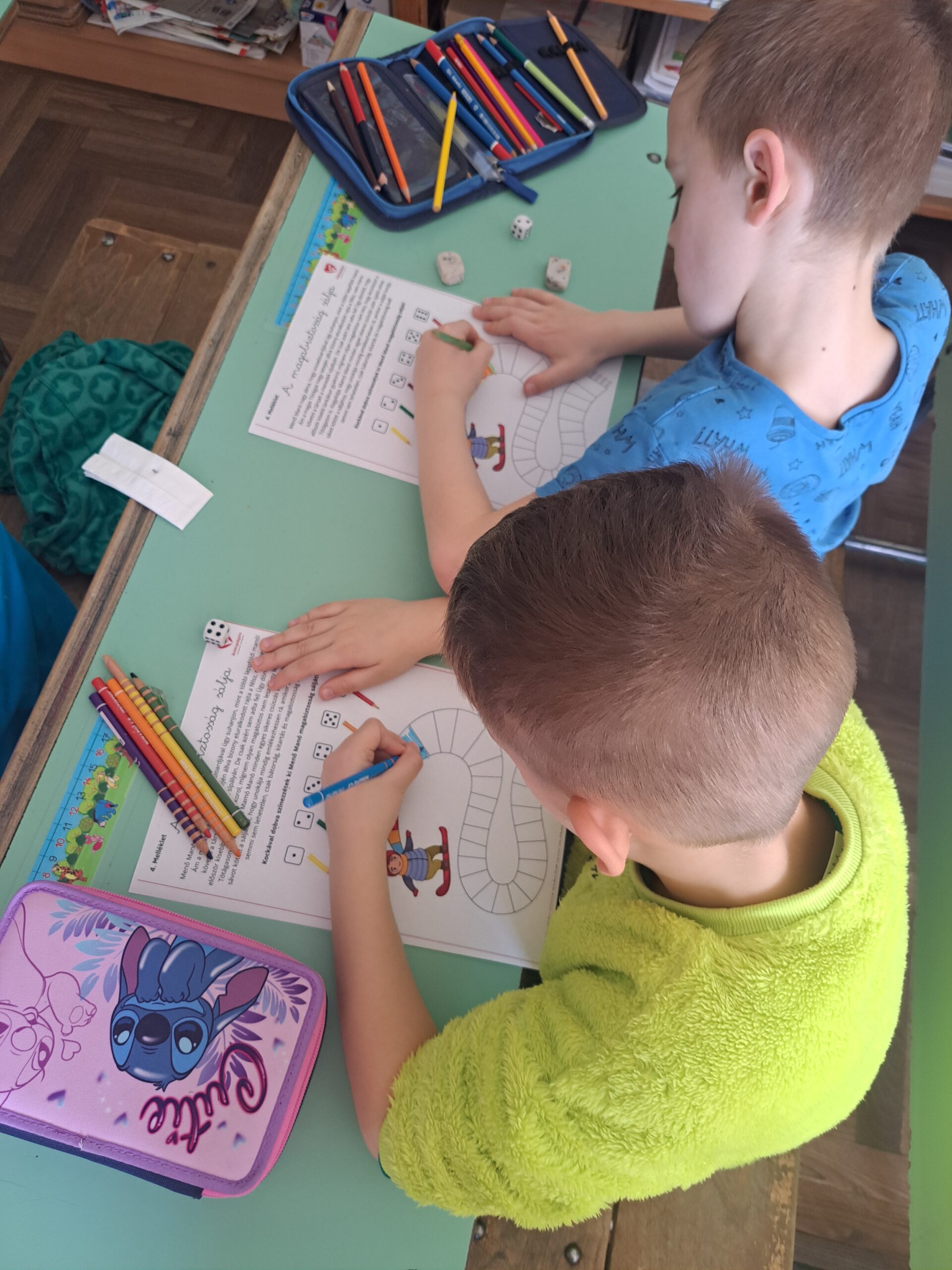 A gyerekek kiszínezik a sálat, aszerint, hogy hányast dobtak a kockával.