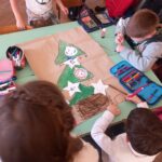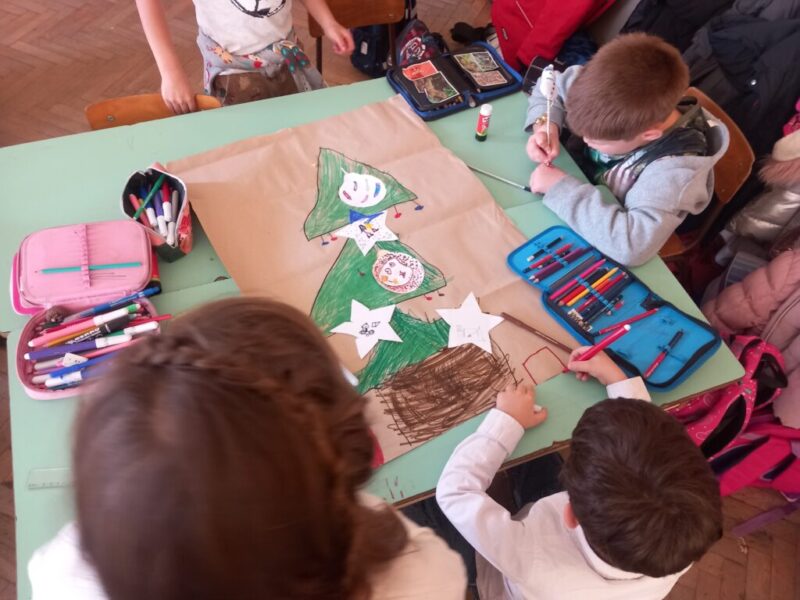 A gyerekek három csoportban készítették a karácsonyfákat és a hozzá tartozó díszeket. Mivel elsősök így a jó cselekedeteket rajzolták.