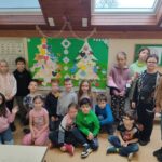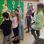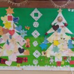 Az osztály faliújságára két fehér fenyőfa alakot tettünk (mert a 20 gyerek gyorsan teletette az elsőt, így kellett készíteni egy másikat is). A december havi jócselekedetek, jótettek kerültek fel a díszekkel együtt és az ajándékdobozok az osztály jócselekedetei.
