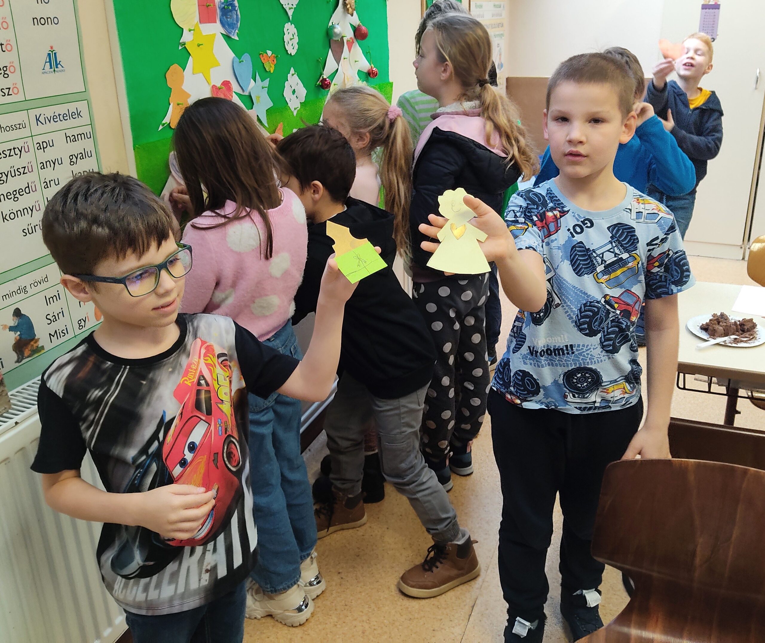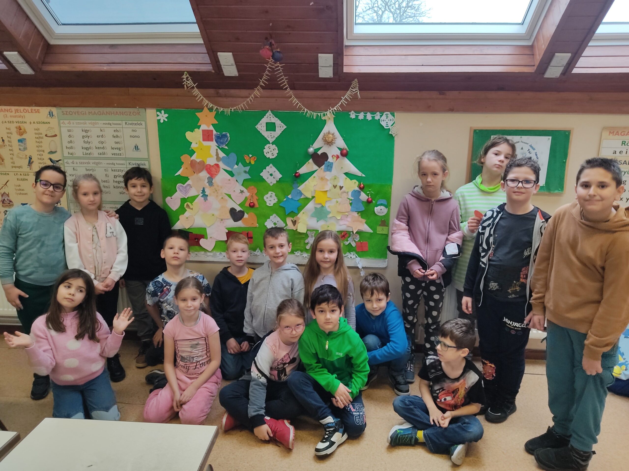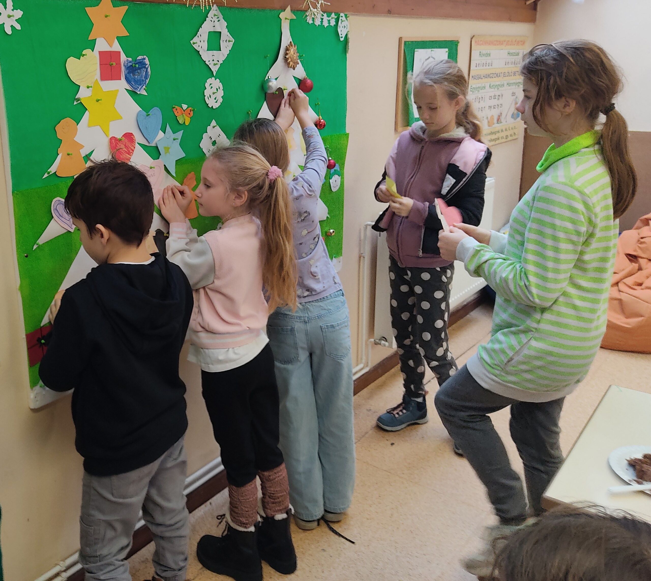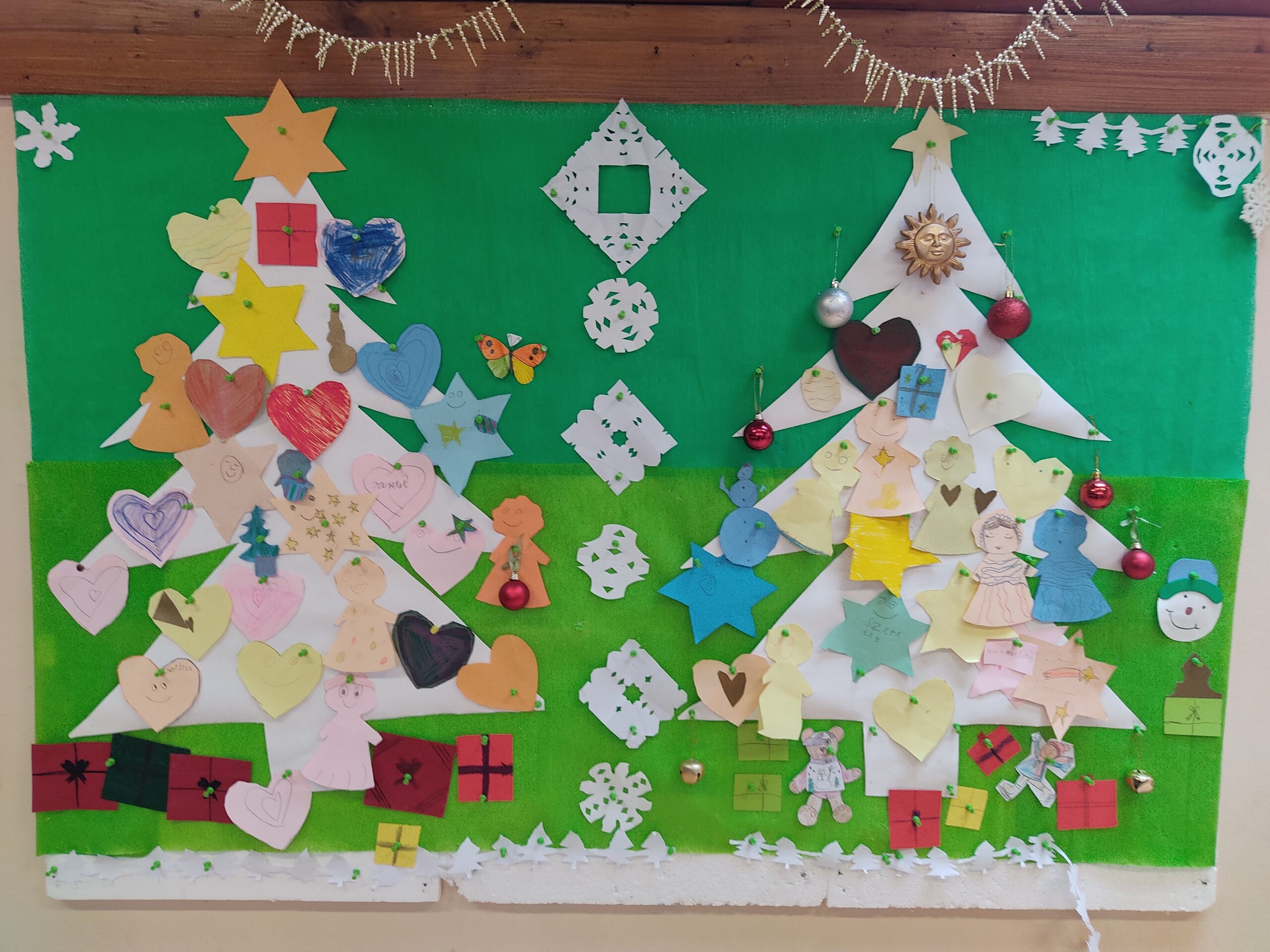 Az osztály faliújságára két fehér fenyőfa alakot tettünk (mert a 20 gyerek gyorsan teletette az elsőt, így kellett készíteni egy másikat is). A december havi jócselekedetek, jótettek kerültek fel a díszekkel együtt és az ajándékdobozok az osztály jócselekedetei.