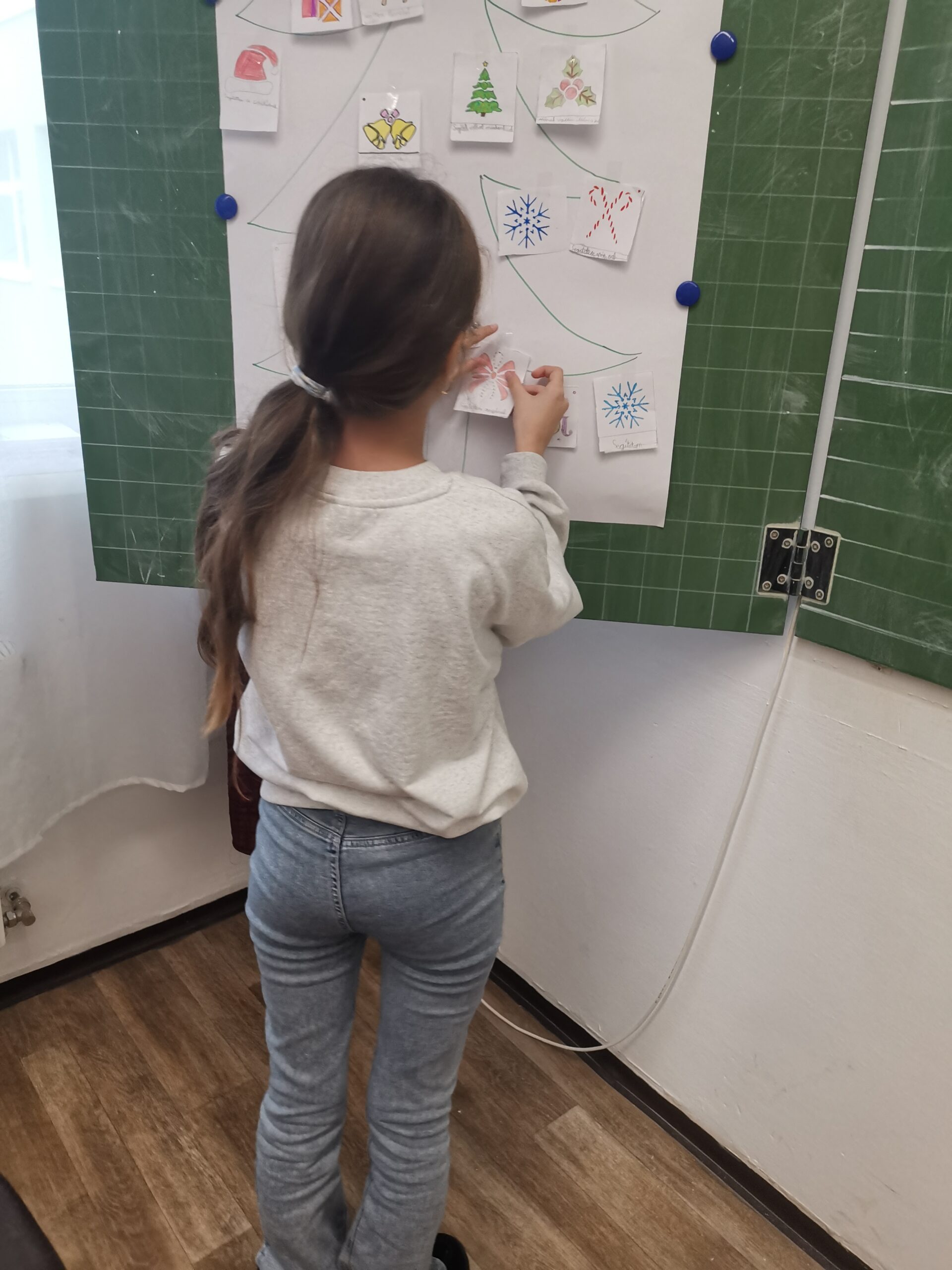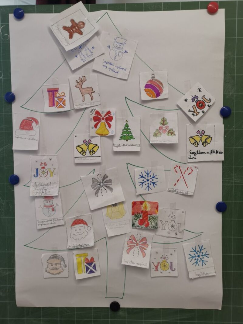 A negyedik osztályos tanulók karácsonyfa díszt készítettek papírból, melyre mindenki felírt egy jó cselekedetét. Mivel minden gyerek szerencsére több jó dolgot is tett idén, ezért több dísz is készült. Az elkészült produktumokat felrakták egy plakátra, mely egy nagy fenyőfát ábrázolt.