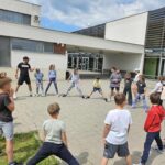 Közös zenés bemelegítéssel nyitjuk meg a rendezvényt az udvaron (13:50):
