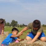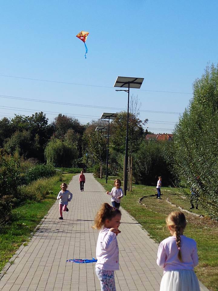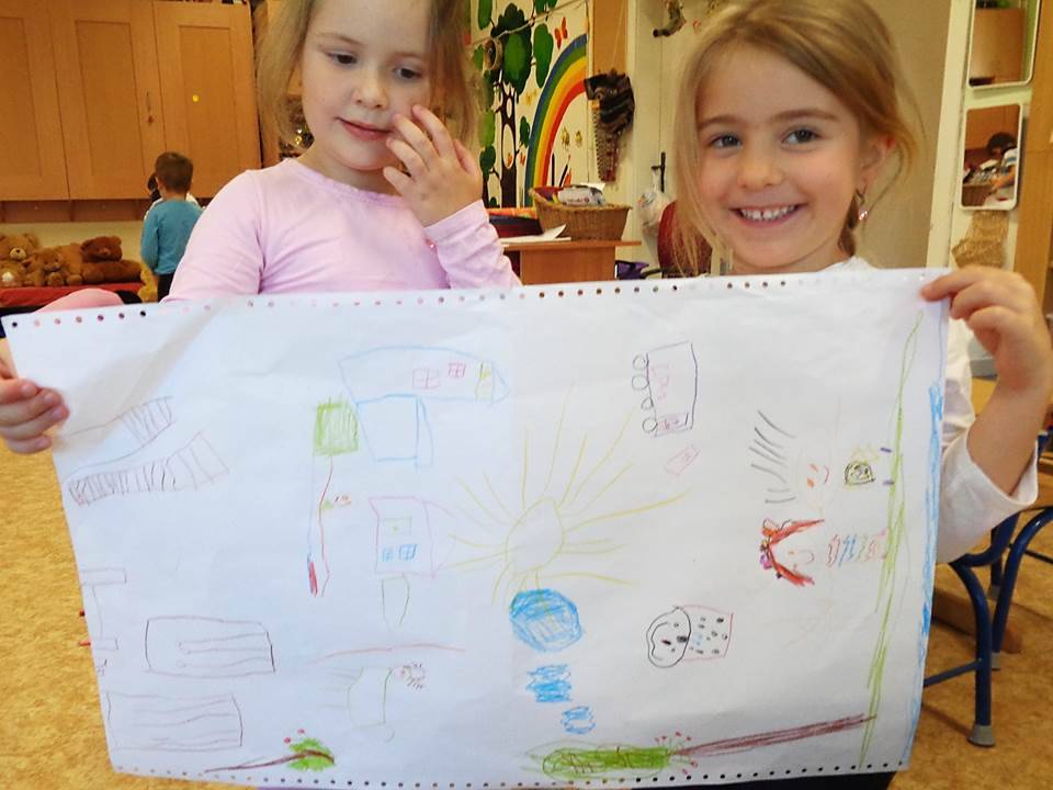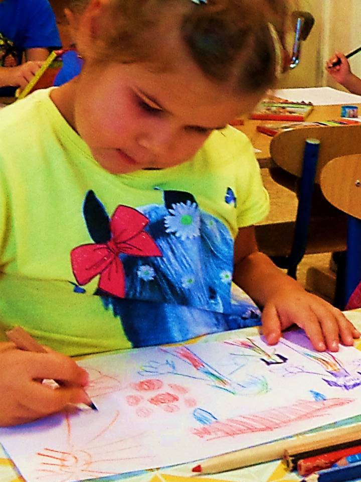 A mostani háromnapos projekt kezdetén a „Szép nap, ölelj most át engem” kezdetű dal volt a bevezető. Ennek nyomán indult a beszélgetés arról, milyen érzés az ölelés, mikor szoktunk valakit megölelni. Érdekes volt, hogy most felmerült a kérdés, hogy mit tegyünk akkor, ha valakit nem szívesen ölelünk meg. A következő alkalom egy relaxációs program volt, amikor a „Szép nap, ölelj most át engem” kezdetű dalt az óvoda udvarának egy csendes, napos, füves területén hallgattuk meg. A gyerekek pokrócokat terítettek le a földre, úgy helyezkedtek el, hogy ne érjenek egymáshoz. Hanyatt fekve hallgatták a zenét. Utána kis beszélgető körben mesélhették el, milyen érzés volt így befogadni a napfény „ölelését”. Harmadik napon egy kis kirándulást tettünk a közeli rétre, ahol ismét a napfény várt minket. Szalmabálára mászhattunk, sárkányt eregethettünk. Több gyermek későbbi rajzában megjelentek ezek az események. Kérdésre, hogy miért mosolyog mindenki a rajzodon; széles mosollyal érkezett a válasz: Mert boldogok!