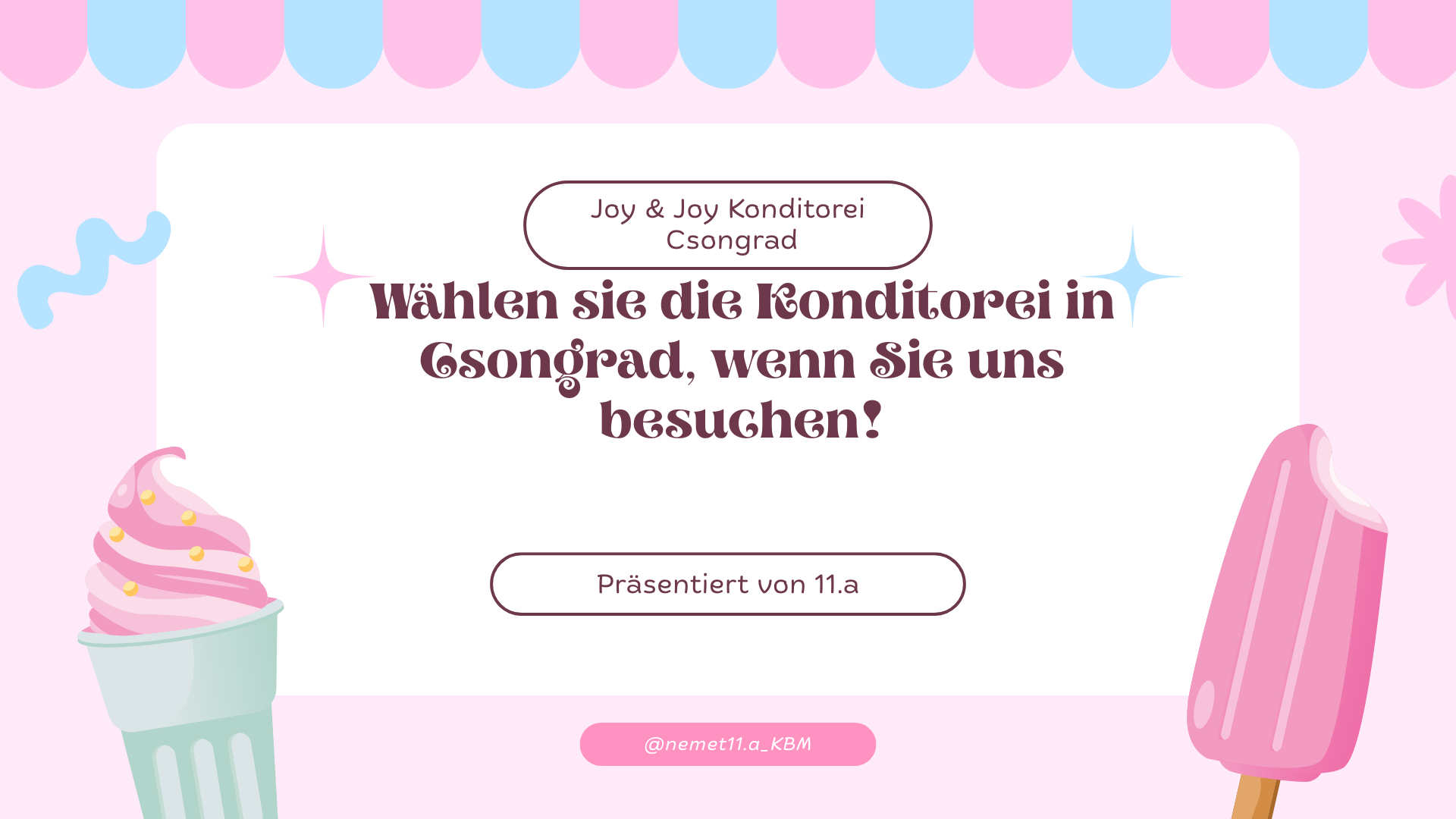 Otthoni feladatként pedig azt kapták, hogy ismerkedjenek meg a Canva-val (ez egy nagyon hasznos képszerkesztő alkalmazás), és ennek a segítségével készítsenek a cukrászdáról egy német nyelvű plakátot. Az elkészült plakátokat természetesen elküldtük a cukrászdának is. Reméljük, hogy nemcsak magunknak, de nekik is sikerült szereznünk ezzel egy apró örömet.