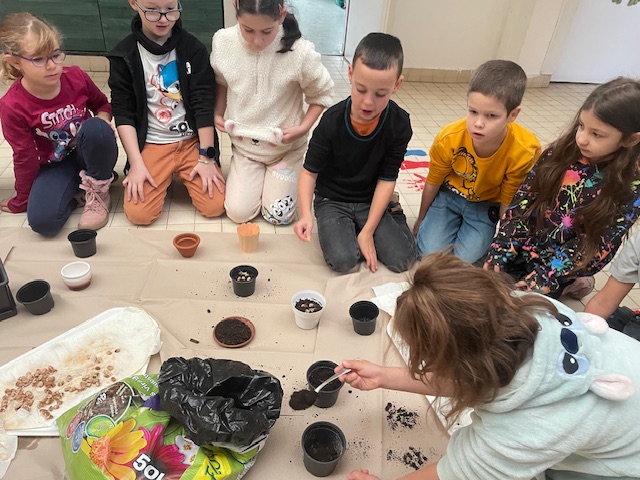 Az egymástól elválaszthatatlan babok történetét is megismertük, színeztünk és csíráztattunk. Az ültetés során számos csírával egymásba kapaszkodott babot találtak, melyek rögtön a mesét juttatták eszükbe. A növénygondozás remekül sikerült. Egész hónapban óvták, öntözték, és sajátuknak érezték a növényeket. A kinti tereprendező munkába is bekapcsolódtunk.
