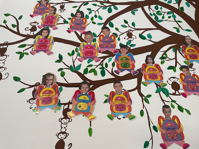 A 13-án zajló kedvesség napján először a szív dobókockákat készítettük el, amiket egy fává építettük össze. Az erősségfánkat a termünket díszítő kismajmos fánk felhasználásával alkottuk meg. Az év elején elkészült arc fotókat egy sablon iskolatáskára ragasztottuk, s mindenkinek a táskájára ráírtuk a rá legjellemzőbb tulajdonságát. Majd a kész rajzocskát feltűztük a falra festett fára. Ezeket le sem fogjuk venni.