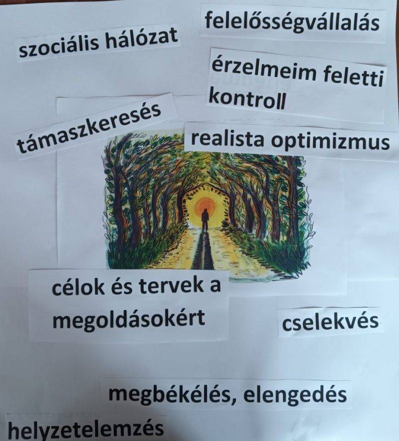 A társas támogatás témakörében a barátságról beszélgettünk. Hogyan kötötted az első barátságodat? Meddig tartott a barátság? Mi tartotta össze? A konkréttól az általános felé haladtunk rangsorolás feladattal. Általában mi tartja össze a barátságokat? A következő fogalmakat kellett rangsorolni értékrendjük szerint: szeretet, társismeret, közös élmények, megbocsátás, bizalom, őszinteség, elfogadás. Első helyre a bizalmat helyezte az osztály, minden társas kapcsolat alapjaként. Külön gondot fordítottunk az önbizalom megerősítésére: A bizonytalanság az élet része. Nem feltétlenül kell mindig minden helyzetben jónak lenni vagy jól teljesíteni! Az önbizalom nem azt jelenti, hogy tökéletesnek gondoljuk magunkat, hanem azt, hogy az erősségeink mellett tisztában legyünk a gyengeségeinkkel és elfogadjuk azokat is, miközben erősségeinkre építkezve próbáljunk megfelelni az élet kihívásainak. Önbizalmunkat folyamatosan erősítsük és ne csak a külső visszajelzésekre építsük önértékelésünket! Önmagunkat elfogadó lelkülettel tudunk csak szeretettel fordulni mások felé.