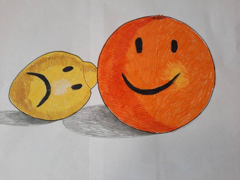 A hála hónapjában videót tekintettünk meg Sam Bernsről, aki 17 éves és egy ritka genetikai betegségben szenved, a korai öregedésben, mégis kiegyensúlyozott életet él. Mi az életfilozófiája? A gyerekek kérdéseket kaptak, amelyre a videón elhangzottak alapján kellett válaszolni. Sam hálás azoknak, akik őt körül veszik, család, barátok. Nem az önsajnálatra koncentrál, inkább a felszabaduló energiáit számára kedves tevékenységekre fordítja, és mindig előre tekint. Hálás minden jóért, amit az élettől kap, hiszen a betegségétől eltekintve is nagyon sok értékes dolgot valósíthat meg az életben. A kamasz fiú életét tekintve, már hálával kell gondoljunk saját életünkre, milyen értékes kiváltság egyáltalán lélegezni, gondolkodni és egészségesen tanulni, dolgozni. Az optimizmus témájánál egy általam készített feladatlapot oldottunk meg, amelyben kifejezéseket kellett vagy optimizmus vagy a pesszimizmus szóhoz húzni: aggodalom, negatív jövőkép, aktív megküzdés, keserűség, humor, feladás, előny keresése, bizakodás, az erőforrásaink felkutatása stb. A gyerekek pontosan be tudták azonosítani a személyiség típusok jellemzőit. Optimizmusszintünket leginkább az befolyásolja, hogy miként értékeljük a stresszorokat és milyen választ adunk rájuk. Belső erőforrásaink megtalálása akár életmentő is lehet egy-egy kritikus élethelyzetben. Főképnek egy nevető narancsot választottunk, háttérbe szorítva a citromot.