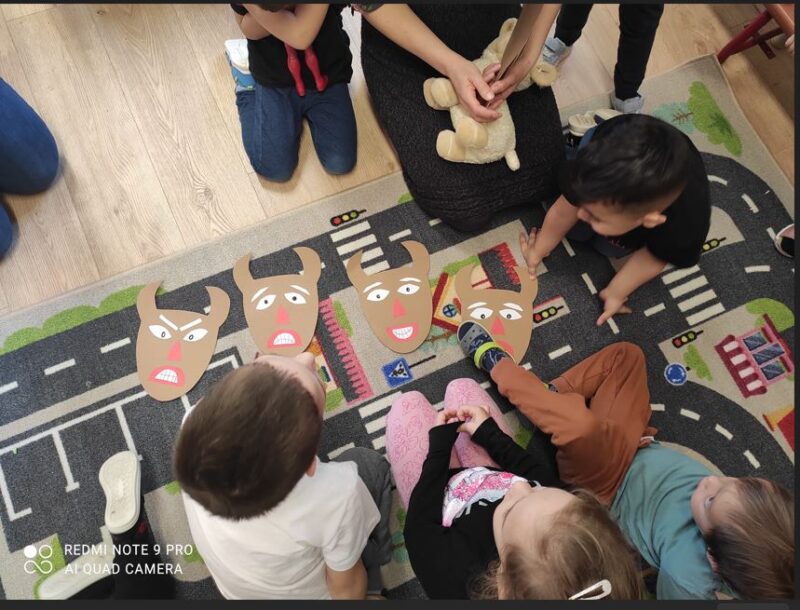 Farsangi időszak lévén a hagyományokhoz kapcsolódva ördög álarcokat készítettem a gyerekeknek és a témát, illetve a kis-középső csoportos korosztály befogadóképességét figyelembe véve négy alapérzelmet jelenítettem meg az álarcokon: a dühöt/haragot, a szomorúságot, a félelmet és az örömöt. Ezeket beszélgetőkörben „tárgyaltuk meg”. A gyerekek jól beazonosították az érzelmeket és példákat is tudtak mondani. A beszélgetőkör a vártnál hosszabbra nyúlt, látszott, hogy erről a témáról nagyon sokat tudunk beszélni, a gyerekeknek minden érzelemről eszébe jutott valami, minden gyermek többször is szót kért. Megbeszéltük, ki miért dühös, miért szomorú, mi az, ami örömet okoz neki és mitől fél.