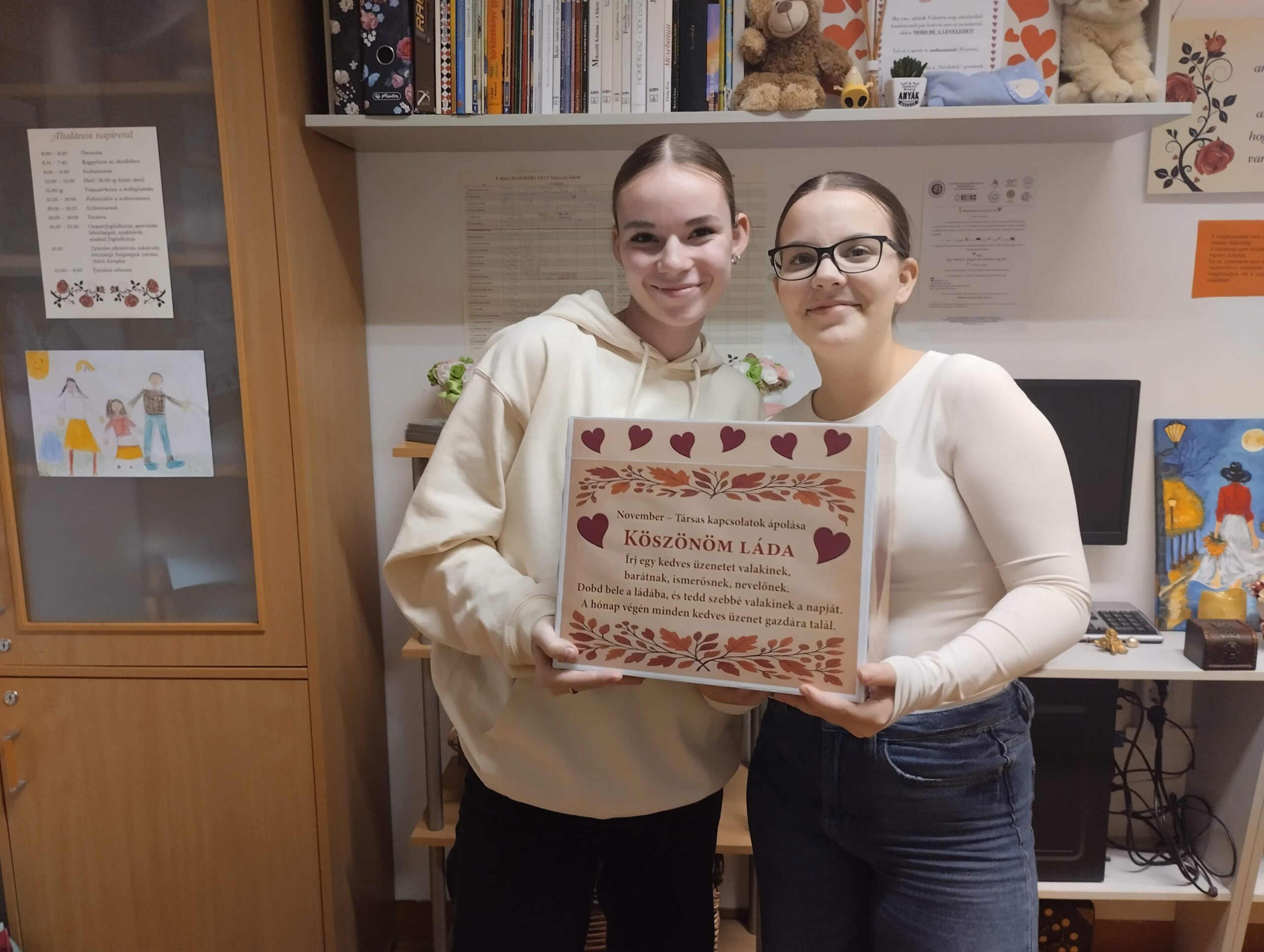 Kollégiumunk Boldogság sarkát az aktuális témához rendeztem be. Plakátot készítettem, melyen idézetek szerepeltek, és a hónap témája. A Boldogság sarok asztalára kerültek a témához kapcsolódó napindító üzenetek, kapcsolatok fontosságáról szóló mesék. Készítettem egy Köszönöm Ládát, amelybe kedves üzeneteket írhattak egymásnak, nevelőknek a gyerekek. A hónap utolsó kollégiumi napján a saját csoportomban lévő lelkes, segítőkész gyermekeimmel osztottuk ki az üzeneteket és csaltunk mosolyt sok gyermek, nevelő arcára. Nagyon örültem, mert szinte tele lett a Láda.