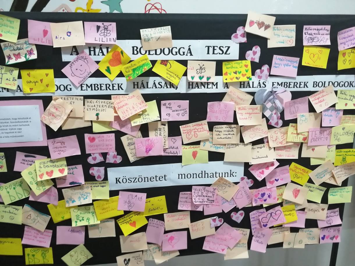 A tavaszi időszak óta rengeteg változást kellett megélnünk, sajnos az online oktatás alatt a boldogságórák nem folyhattak olyan hatékonyan, mint előtte. Az év kezdés feladata, küldetése, a következő: igyekezzünk mindent megtenni annak érdekében, hogy az életöröm visszaszivárogjon porcikáinkba, mert ez most létfontosságú. Ugyanis az öröm, a derű, a nevetés, a boldogság, olyan, mint a vitamin, erősíti az immunrendszerünket, amire a jelen helyzetben nagyobb szükségünk van, mint korábban bármikor. Egy évvel korábban hálafát készítettünk, az idén hálafalat. Bevontuk az iskola valamennyi tanulóját, tanárát a munkába. Az aulában felállított falon mindenkinek lehetősége volt elmondani, lerajzolni, azt, hogy ő kinek és miért tartozik hálával. Óriási volt az érdeklődés! A szünetekben a gyerekek írtak és olvasgattak, beszélgettek sokat a témáról. Jó volt látni, megtapasztalni az érdeklődést. Ezt a hónapot boldogságérzéssel zártam.