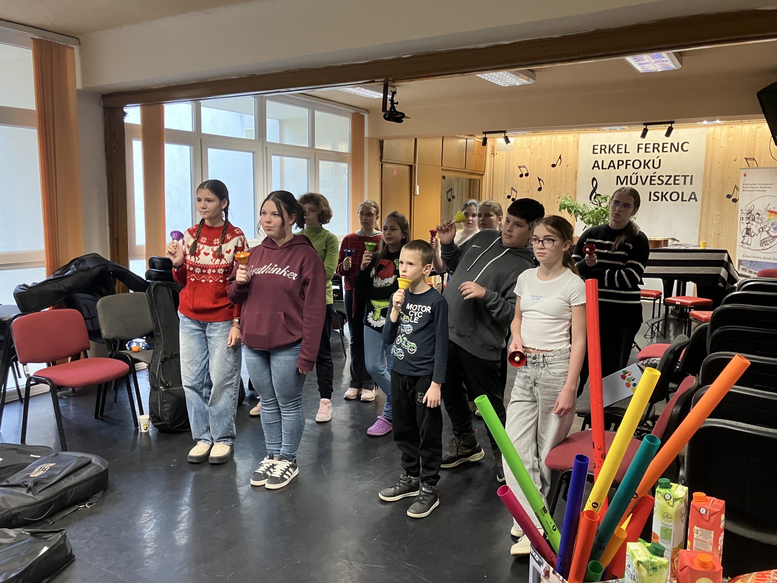 Ezen a zenekari próbán a karácsonyra hangolódva felvételt készítettünk a szülők számára – Carol of the Bells c. klasszikus mű feldolgozását játszottuk el a zenekarral. Ez lett a mi ajándékunk a szeretteinknek. S miután a felvétel elkészült sokat beszélgettünk, játszottunk és zenéltünk színes sípok és csengők segítségével 🙂