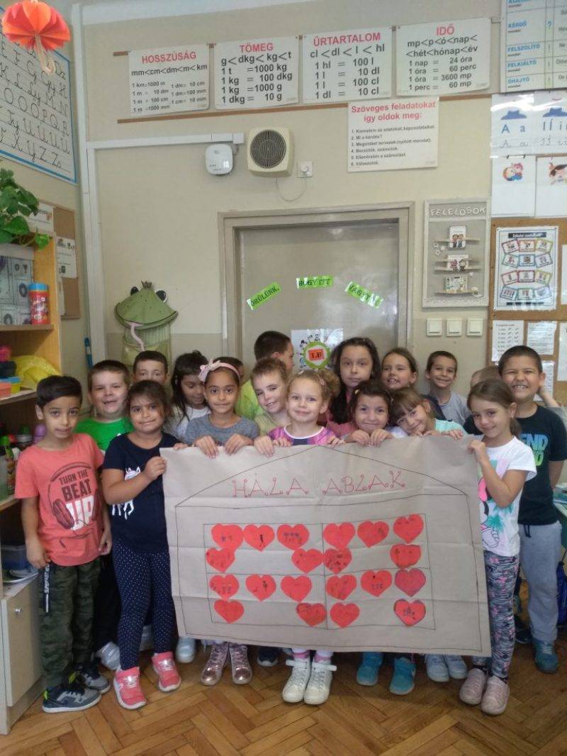 A szeptemberi hónapban a 3 választható téma közül,mi az elsőt az Ablak a világra témakört választottuk. Így első osztályban,amíg nem tudnak írni elég nehéz a feladatunk. De mindenképp igyekszem kreatívan megoldani az aktuális feladatot. Az óra végén a gyerekek a saját kivágott kis szívecskéjükre lerajzolták,hogy ők miért hálásak. Majd közösen felragasztottuk egy közös ,,hála ablakba”. Nagyon tetszett nekik a feladat.