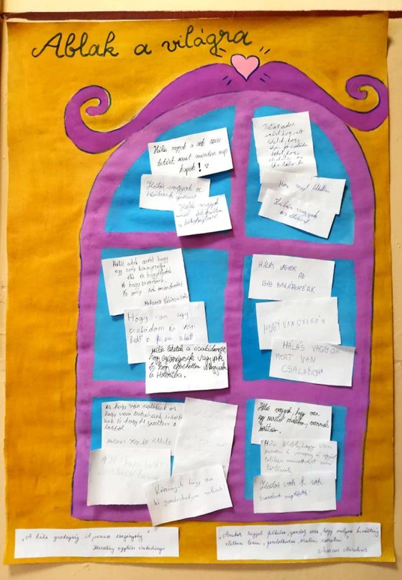 Baráti hangulatban telt az első boldogságóra. A beszélgetés során körbejártuk a hála fogalmát, majd saját tapasztalatainkról meséltünk. Végül elkészült az Ablak című munkánk, amelyben a csapat tagjai egyenként leírták, hogy miért hálásak az életben.