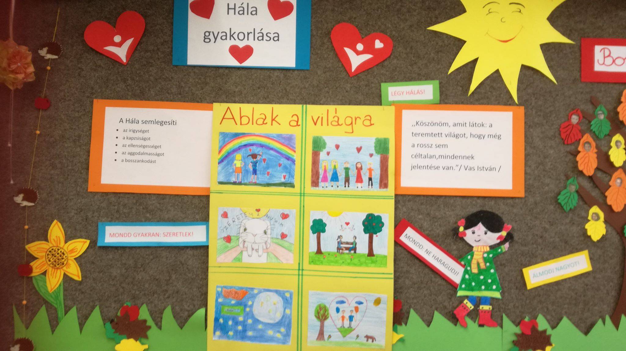 Már 4. éve tartunk boldogságórákat. A gyerekek már sok ismeretet szereztek a hála témakörében. Az idén is elkészült a havi témát tükröző faliújságunk. Az ablakból jól látszik, miért éreznek hálát a gyerekek. Ezek között szerepel a természet, az állatok, a barátok, a haza szeretete és érdekességként a szerelem is helyet kapott. Itt látszik, hogy milyen gyorsan repül az idő, lassan kiskamaszok lettek.