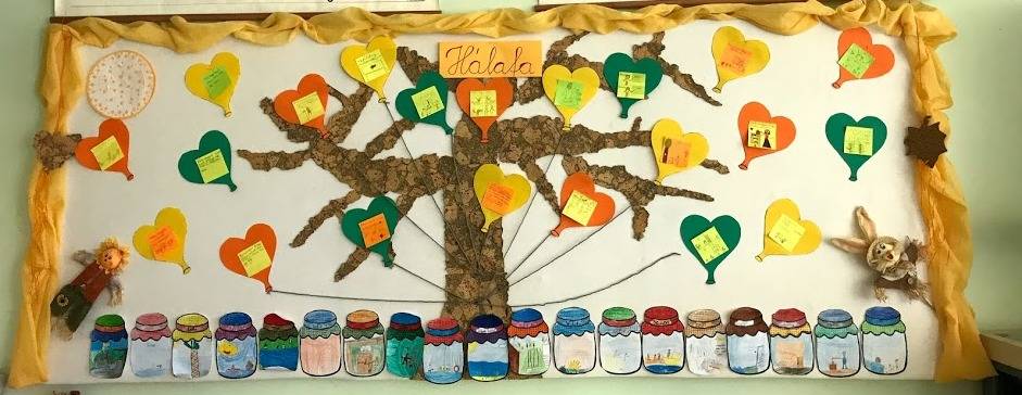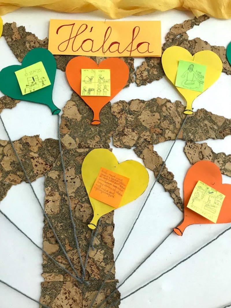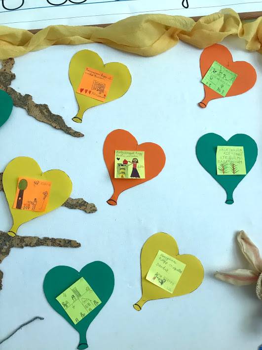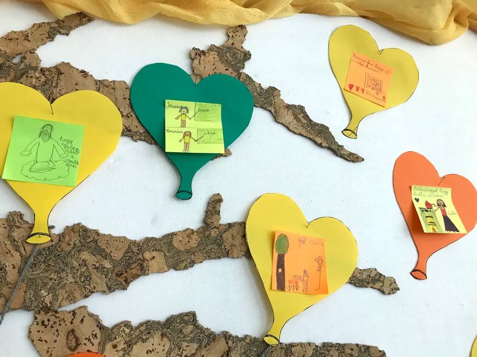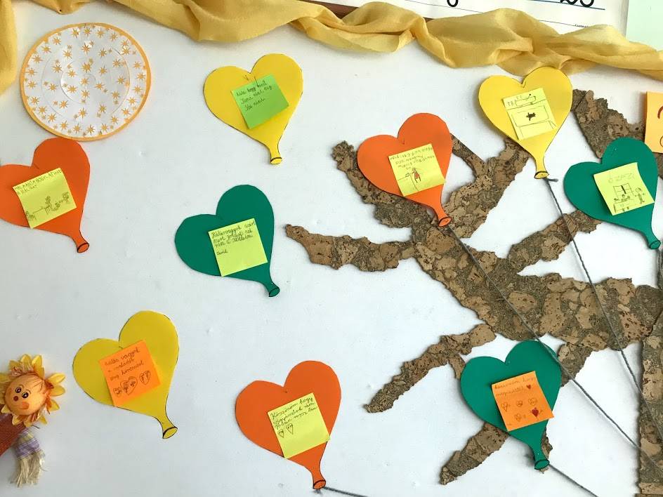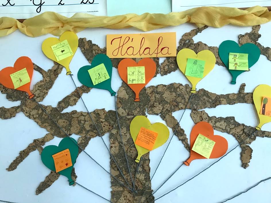 A gyerekek kis lapokra leírták, vagy lerajzolták, hogy kinek, miért hálásak. Ezeket szív alakú lufikra ragasztottuk. A tanterem hátsó falán található „ablakon” kitekintve láthatjuk a hálafát a lufikkal.