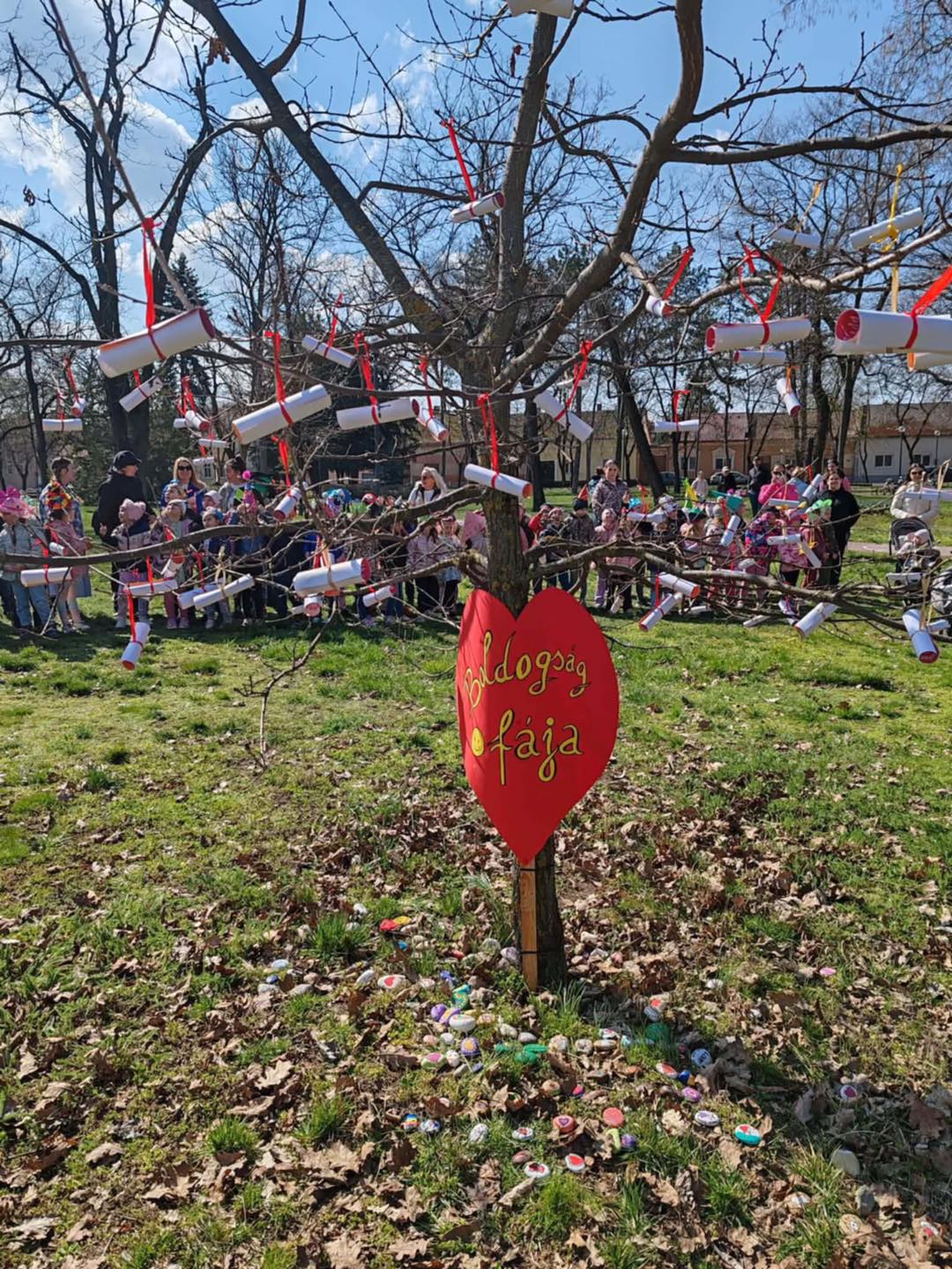 A Boldogság fát körbe állva énekelték a gyermekek a Tavaszi szél vizet áraszt című dalt, az Én kis kertet kerteltem, végül a Kicsi vagyok én, boldog leszek én kezdetű dalt, melynek köszönhetően az odalátogatók érzelmileg ráhangolódtak erre a jeles eseményre. A Boldogság fa is feldíszítésre került különböző kedves és motiváló üzenetekkel.