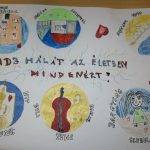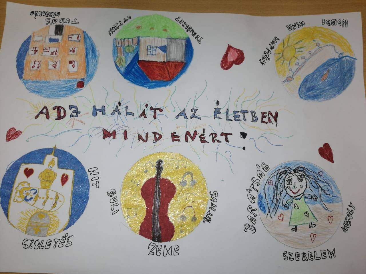8.OSZTÁLYOS TANULÓINK A DAL MEGHALLGATÁSA UTÁN,BESZÉLGETŐKÖR KERETÉBEN A HÁLA DEFINÍCIÓJÁT KERESTÉK MEG KÖZÖSEN.A NYÁRI ÉLMÉNYEK FELIDÉZÉSÉN TÚL,KOMPLEX MÓDON KÖZÖS PLAKÁTON ÖRÖKÍTETTÉK MEG A MONDANIVALÓJUKAT.