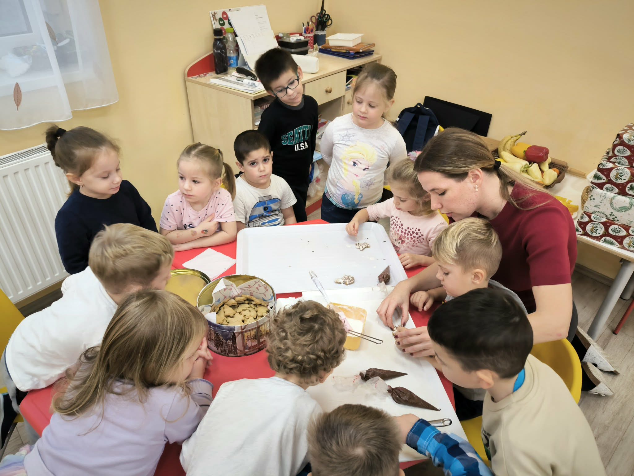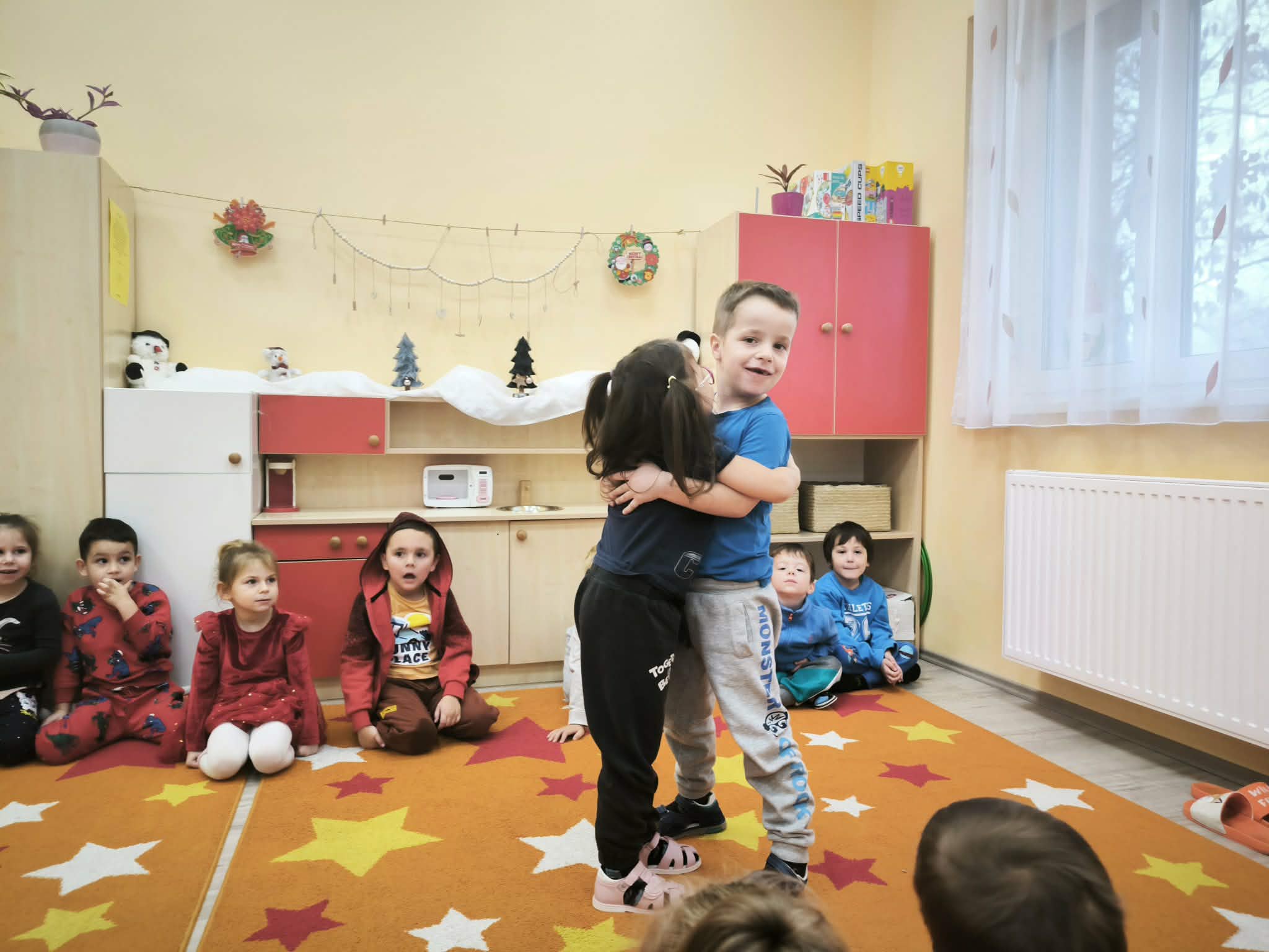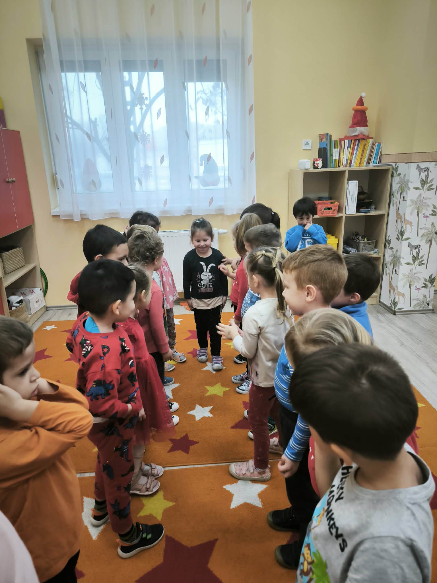 A december az állandó készülődés, várakozás hava. Ebben a felfokozott hangulatban igenis le kell kicsit lassulnunk, meg kell állunk, egymás felé kell forulnunk. Ezt próbáltuk ersősíteni a gyerekekben is. Julia Donaldson: A legcsinosabb óriás című meséje remek alapot adott, hogy felismerjük a jó cselekedetek varázsát. A mesehallgatás után beszélgettünk kicsit a meséről, és arról, hogy ki milyen jócselekedetet tett mással, esetleg mit tettek vele. Visszatérő motívum volt a szülők segítése, szomorú pajtásuk megvigasztalása vagy egyszerűen csak egy ölelés. Az ötletekből néhányat el is játszottunk, amit a gyerekek külön élveztek. A hónapban többször játszottuk a Fuss és ölelj játékot, igazi kedvenc lett, illetve a Szeretetfolyosón is többször átmentek a gyerekek. A hónapban tartottunk egy barkácsdélutánt is, melyen a gyerekek szüleikkel együtt alkothattak karácsonyfa díszt. Az alkalom nagyon jó hangulatban telt, a végén pedig megvendégeltük a szülőket mézeskaláccsal, amit korábban a gyerekek készítettek, díszítettek. A gyerekek önállóan is készítettek karácsonyfa díszt, ez volt az ő meglepetésük a szüleik számára.