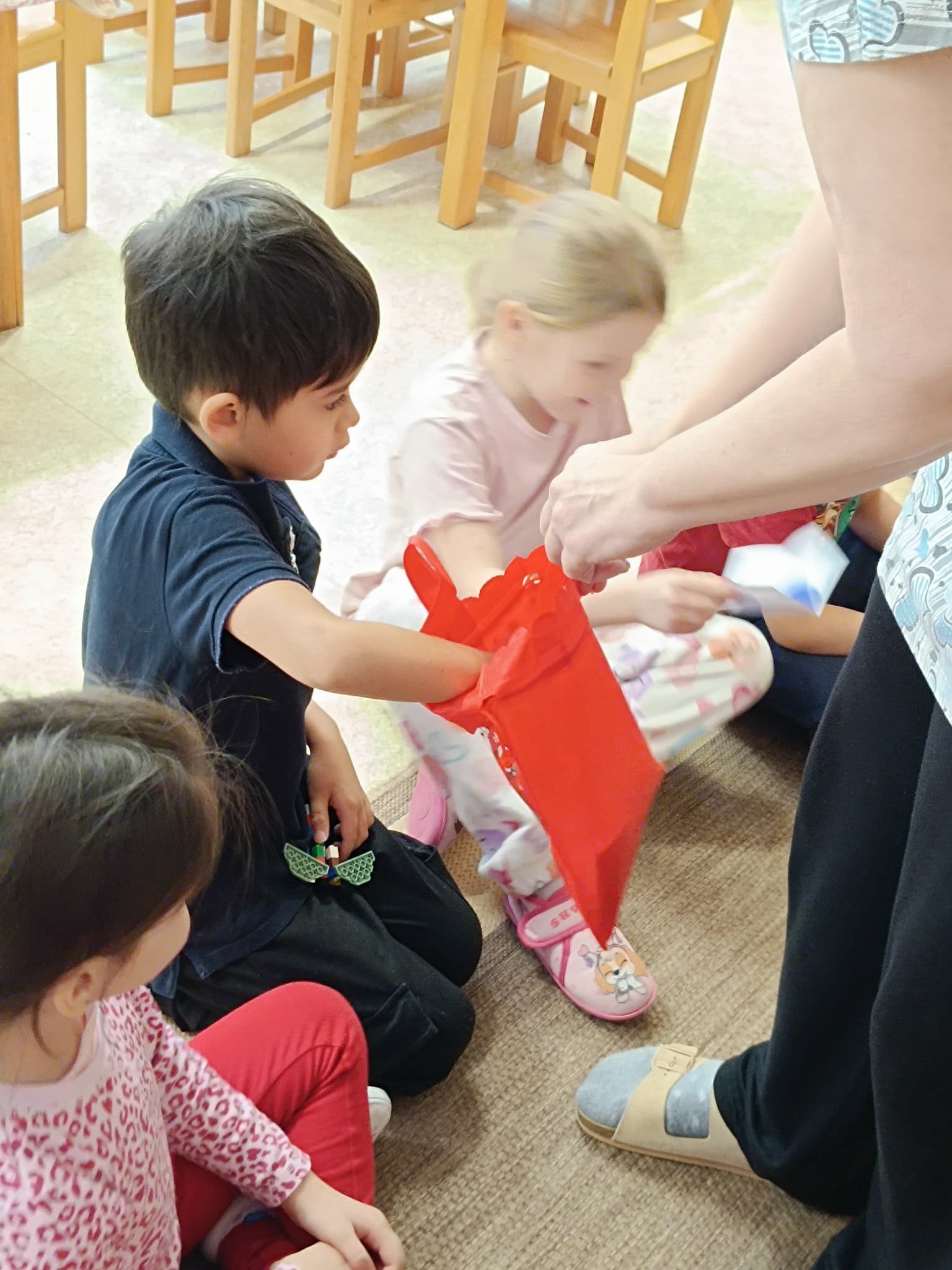December elején izgatottan húzták ki a gyerekek egymás jelét egy zsákból. Ezt követően elkezdődött a szorgalmas és titkos munka, minden gyermek a kihúzott társának készíthetett valami szépet. Sokféle dekorációs anyagot kínáltam fel a barkácsoláshoz, és a gyerekek keze nyomán szebbnél szebb ajándékok készültek. Karácsony napján megnyitottuk a Szeretet-postaládánkat, amelyben már ott várták a kis meglepetések, hogy kis gazdáik átadják őket.