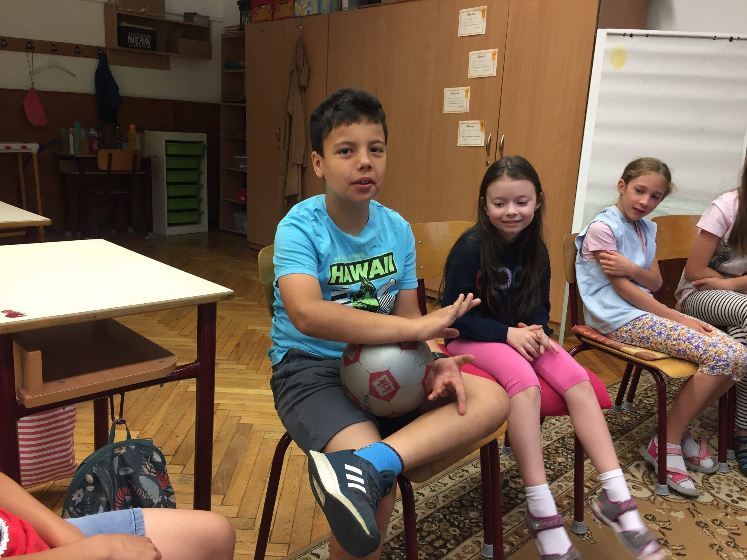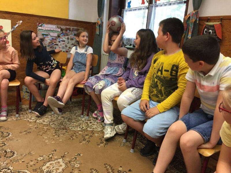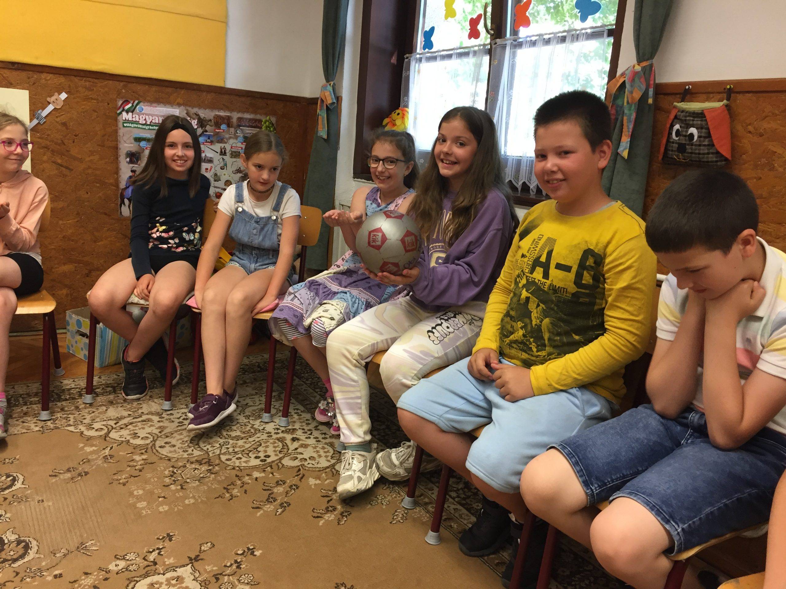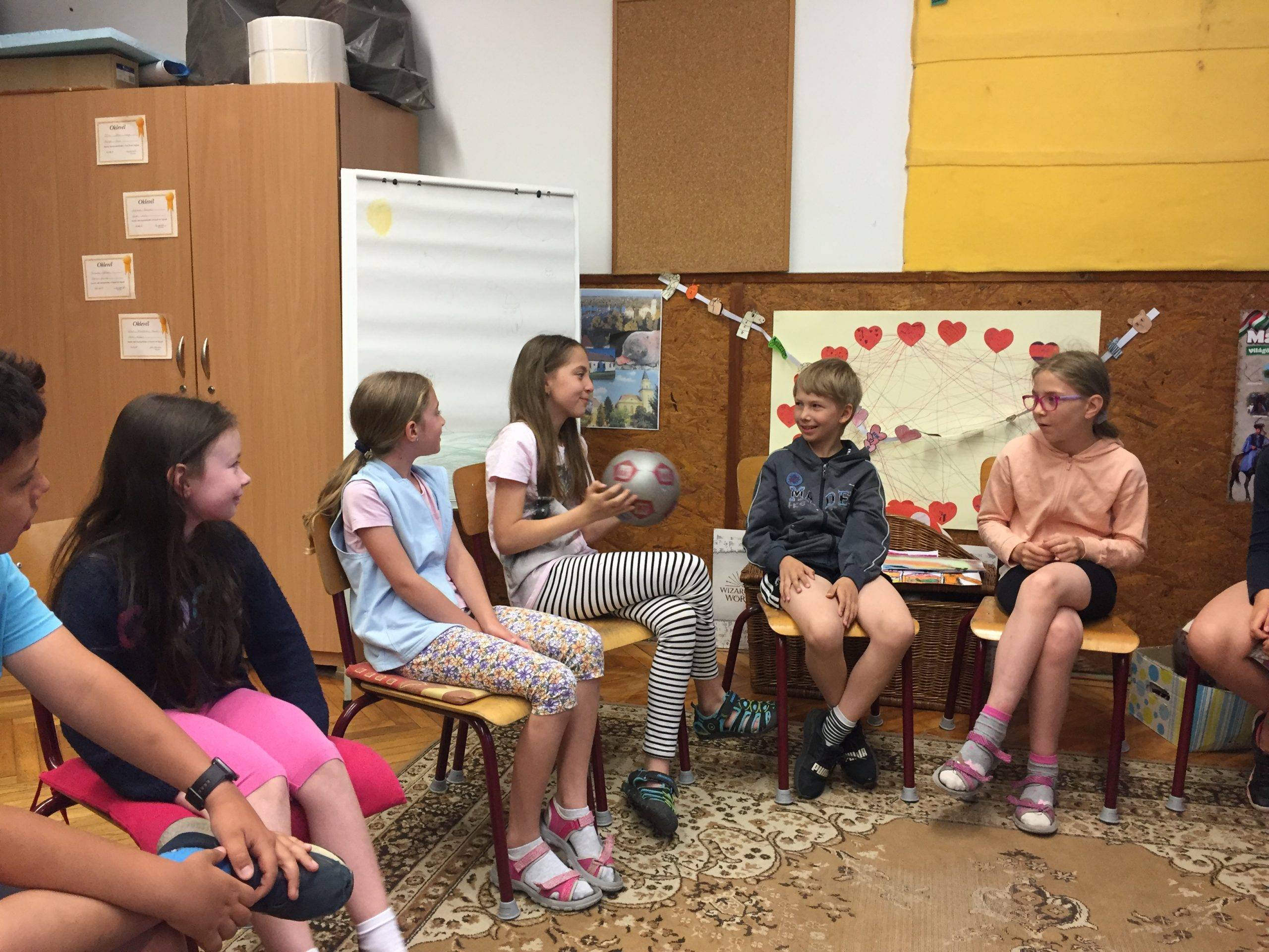 Az órát beszélgetéssel kezdtük. Mindenki választott egy kártyát. Hogyan érkeztél a mai órára? Hogy érzed most magad? Ez alapján lett kiválasztva a kártya. Mindenki elmondta a választása okát. Meghallgattuk a hónap meséjét, és mindenki választhatott, hogy melyik ajtón menne be. Majd egy labda segítségével eljátszottuk az Adok neked egy… játékot.