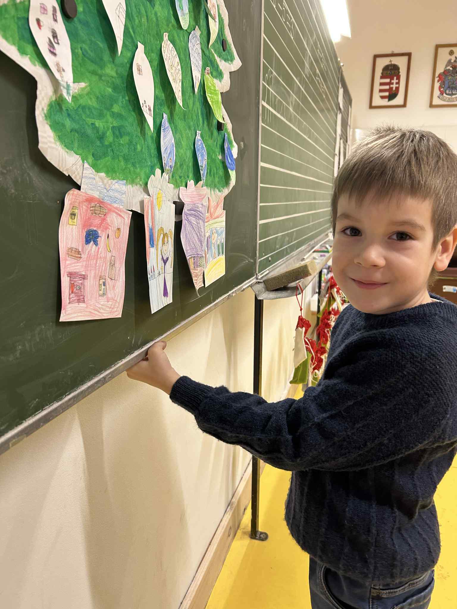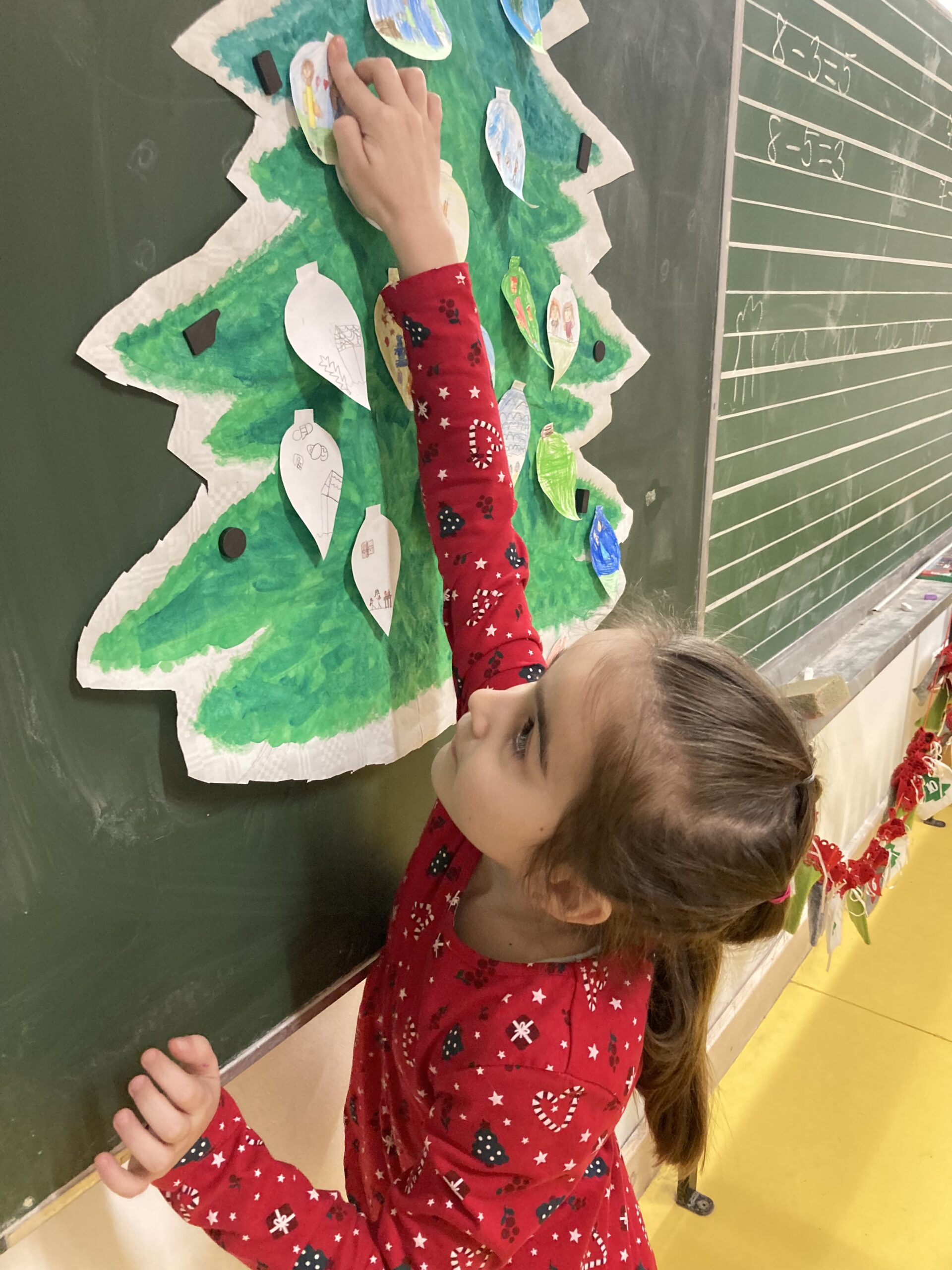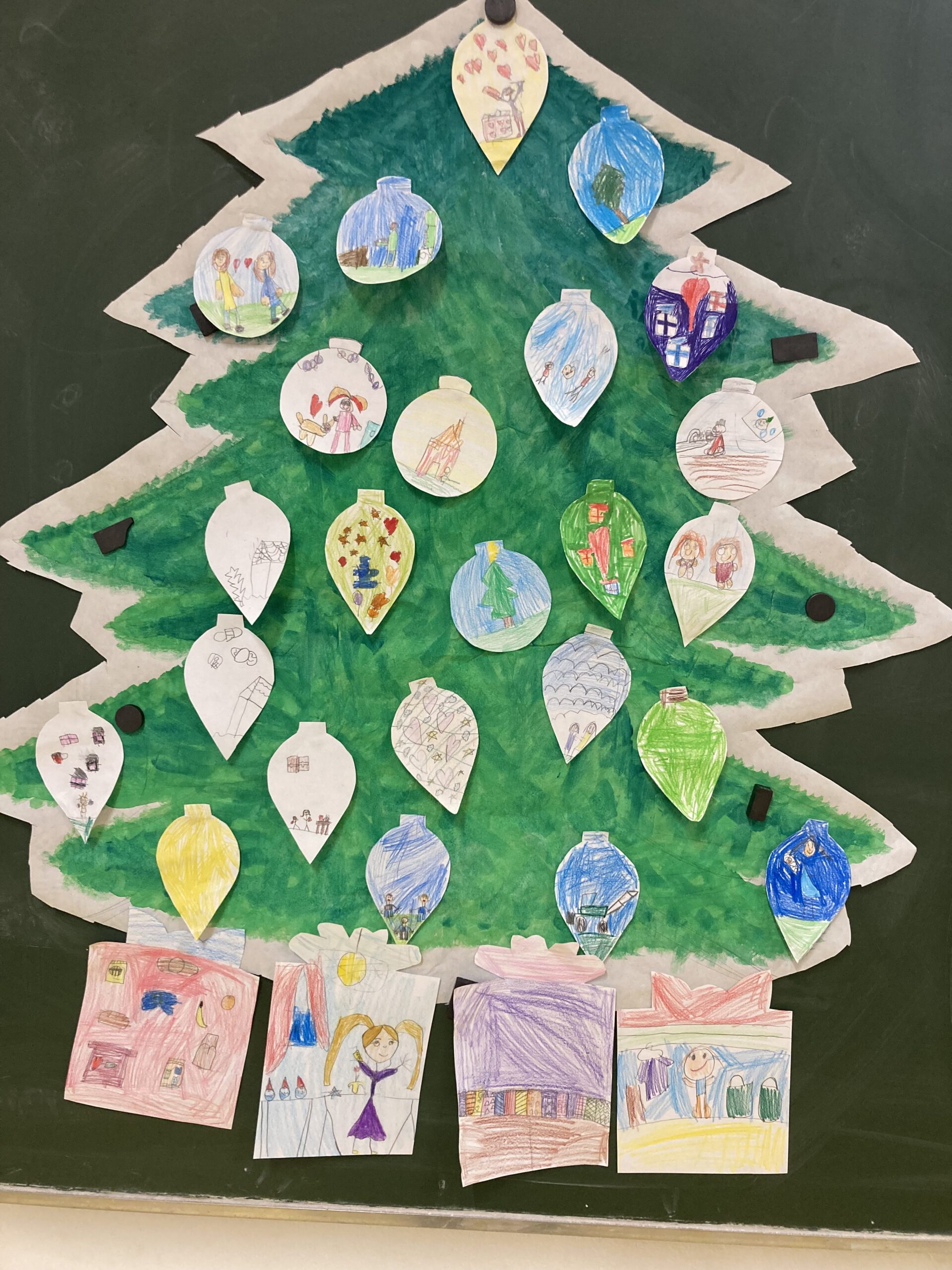 Az első decemberi boldogságórán beszélgettünk arról, hogy miért jó másokkal jót tenni, másoknak örömöt szerezni. Ezután csomagolópapírra egy nagy fenyőfát festettünk, amit a táblára tettünk fel. A fán olyan karácsonyfadíszek pompáztak, amelyeken a gyerekek egyéni jótettei voltak lerajzolva. A fa alá ajándékdobozok kerültek, amelyeken a fent említett jótékonysági tevékenységeket illusztráltuk. Munkálkodás közben Bagdi Bella dalokat hallgattunk, kedvencünket (Ha boldog vagy…) többször is.