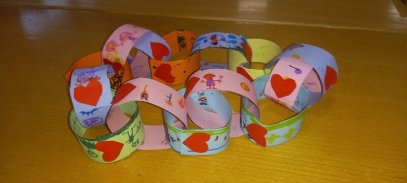 A gyerekek a képek alapján felidézték saját, megélt jótetteiket. A játék elmélyítéseként minden gyermek lerajzolta egyik jótettét egy papírcsíkra, amelyekből közös „szeretetláncot” fűztünk össze. Zárásként megbeszéltük, hogy tetteink fényt gyújtanak a szívünkben.
