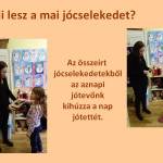 Az osztály adventi naptárának zsebecskéi a gyerekek neveit rejtették. Minden nap megnéztük, hogy az aznapi zseb kinek a nevét rejti, ő lett a nap jótevője. A jótevő húzott a dobozból egy jócselekedetet, amit a nap folyamán kellett teljesítenie.