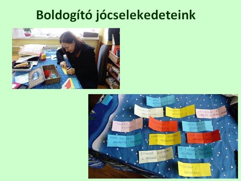 Színes lapokra felírtam a gyerekek által összegyűjtött jócselekedeteket, dobozba tettük, hogy minden nap kihúzzunk belőle egy-egy segítő cselekvést.