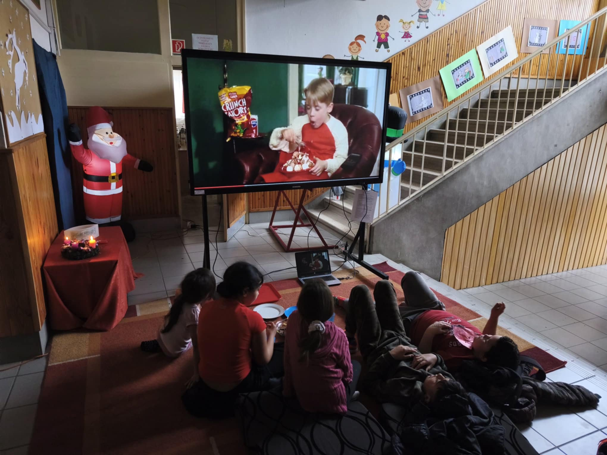 Miután átadták egymásnak a gyerekek a piros szívet, és feltűztük, otthonias hangulatban, szőnyegen, szivacson feküdve, nassolnivalókkal, megnéztük a kért karácsonyi filmet: Reszkessetek betörők 1.részét.