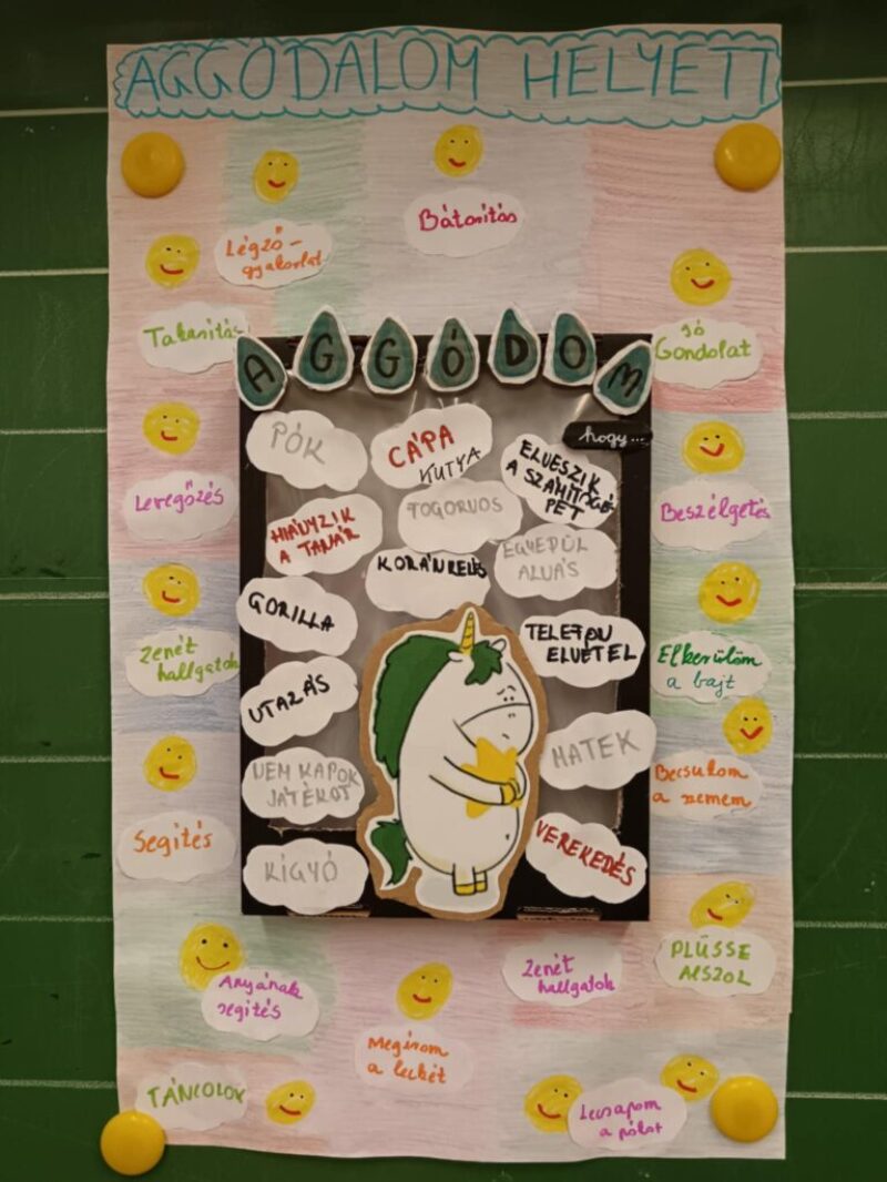 A gyerekek igyekeztek megfogalmazni, milyen helyzetekben szoktak aggódni. Az aggodalmaikat egy-egy cetlire felírták, beletettük egy dobozba, jelezve, hogy azokat „beskatulyázzuk”, nem engedjük onnan ki őket, nem engedünk teret az aggodásainknak, félelmeinknek. Helyette, hogy milyen megküzdési módokat használnánk; ezeket emeltük ki, színes filcekkel felírva a plakátunkra, hogy ezek legyenek a hangsúlyosak.