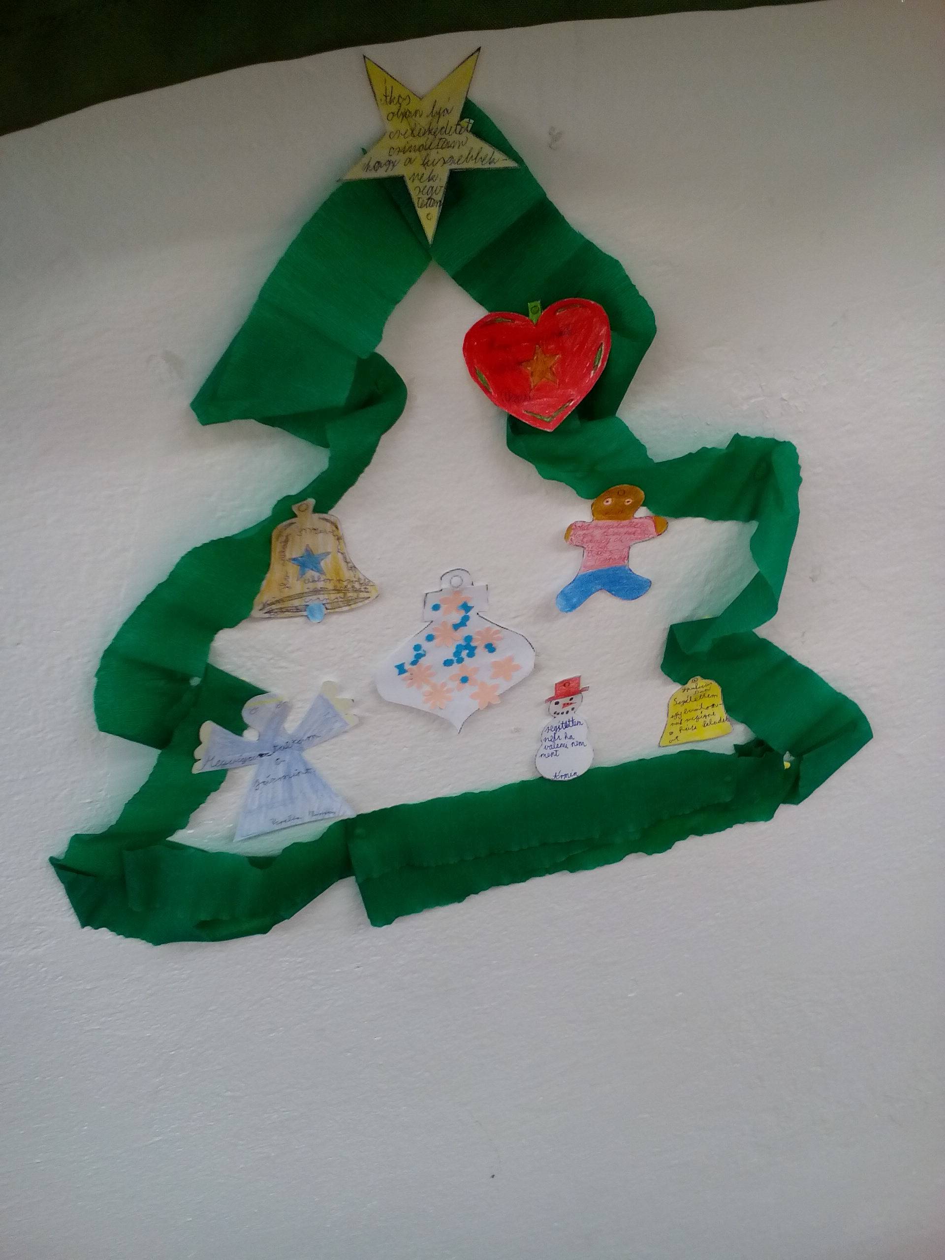 Decemberben rájöttünk, hogy mindenki tett jót, s ezt egy kis karácsonyfán díszekbe is beírtuk. Mivel az osztály létszáma 9 fő, így kicsi lett a fánk, de így is nagyon sok tanuló 2 díszbe is írt olyan jótettet, amit szeptember óta pozitív cselekedetnek tartott.