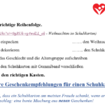 Először az órán megnéztünk egy német nyelvű videót arról, mi is ez az akció, hogyan kell feldíszíteni a dobozt, mi az, ami belekerülhet és mi nem. Miután megnéztük a filmet, feladatokat oldottunk meg a látottakkal kapcsolatban: Először sorba kellett állítani a doboz előkészítésével és a gyűjtőpontra juttatásával kapcsolatos tevékenységeket, majd ki kellett válogatni a megadott tárgyak közül azokat, amelyek belekerülhetnek a dobozba és amelyek nem (pl. veszélyes, törékeny, folyékony dolgokat nem szabad a dobozba tenni).