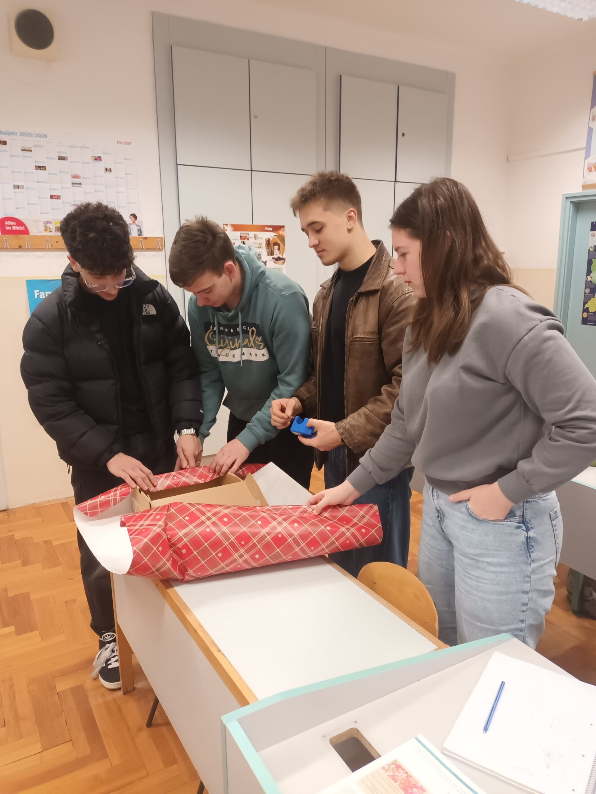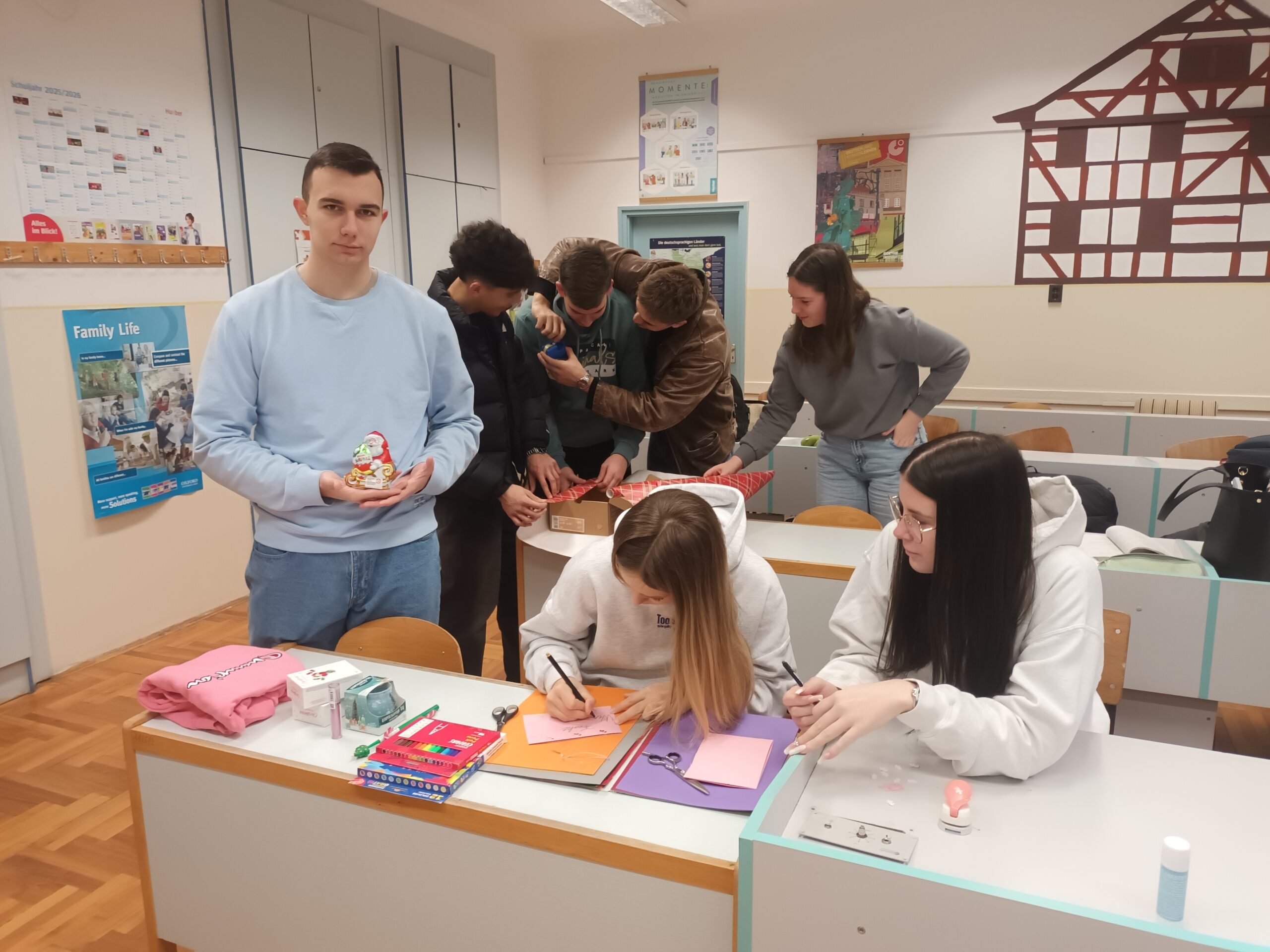 Először az órán megnéztünk egy német nyelvű videót arról, mi is ez az akció, hogyan kell feldíszíteni a dobozt, mi az, ami belekerülhet és mi nem. Miután megnéztük a filmet, feladatokat oldottunk meg a látottakkal kapcsolatban: Először sorba kellett állítani a doboz előkészítésével és a gyűjtőpontra juttatásával kapcsolatos tevékenységeket, majd ki kellett válogatni a megadott tárgyak közül azokat, amelyek belekerülhetnek a dobozba és amelyek nem (pl. veszélyes, törékeny, folyékony dolgokat nem szabad a dobozba tenni).