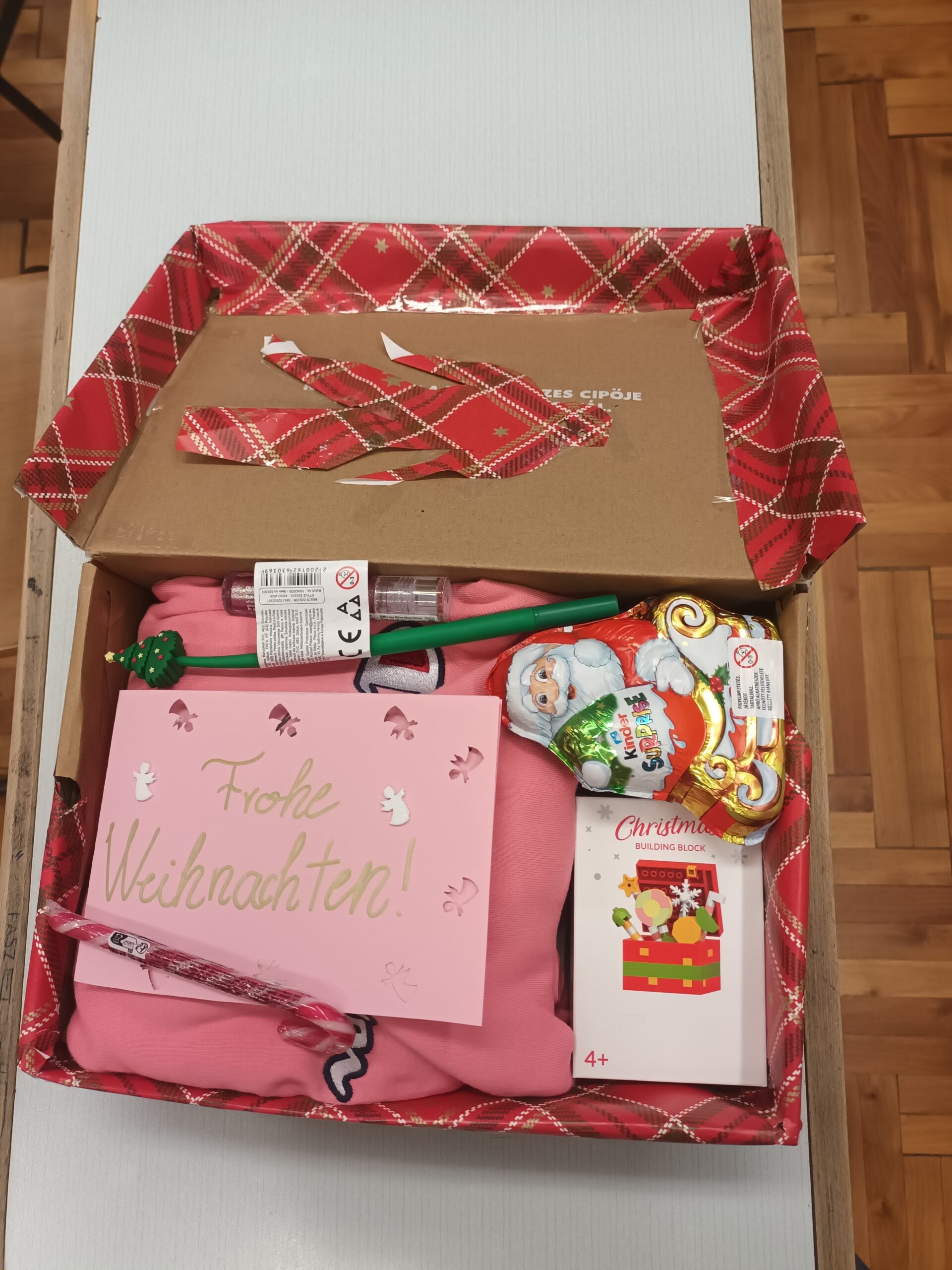 Ezután mi magunk is összeállítottunk egy cipősdobozt: először kitaláltuk, milyen nemű és milyen korú gyereket szeretnénk meglepni (mi egy 15-17 éves lánynak készítettünk ajándékot, azzal az indokkal, hogy biztosan mindenki inkább a kisebb gyerekekre gondol), majd összeállítottuk a listát, mindenki vállalt egy-egy ajándékot (ez lehetett pl. iskolaszer, kozmetikai cikk, rajzeszköz, ruházati kiegészítő). Végül a cipősdobozt megtöltöttük az ajándékokkal, gondosan becsomagoltuk és kidíszítettük, készítettünk egy üdvözlőkártyát, amit mindannyian aláírtunk, majd együtt leadtuk a gyűjtőponton.