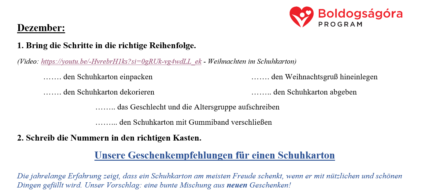 A Boldogságóra programban december a jócselekedetek hónapja, ezért a 12F németes csoportjával csatlakoztunk az iskolánk cipősdoboz akciójához.