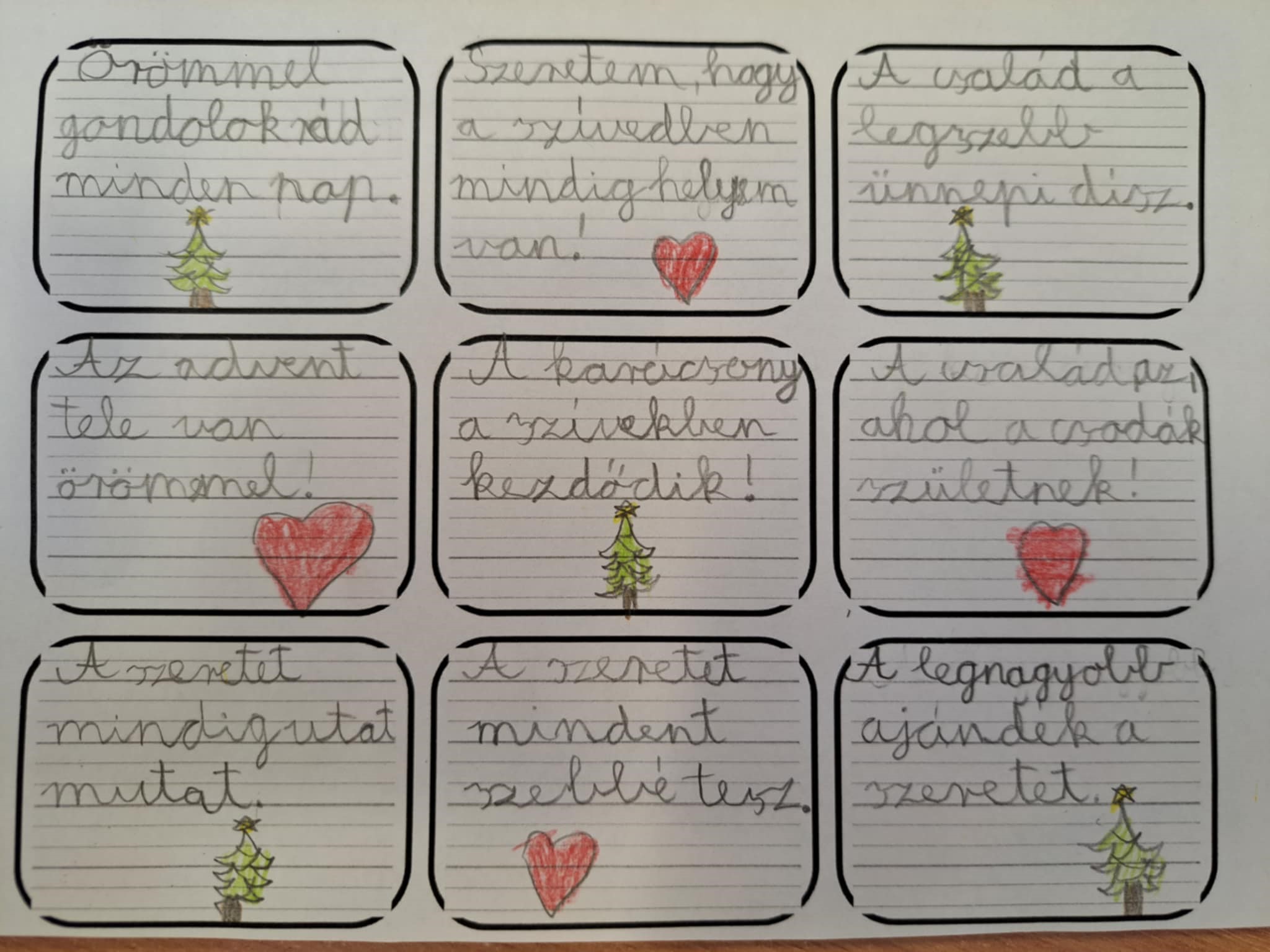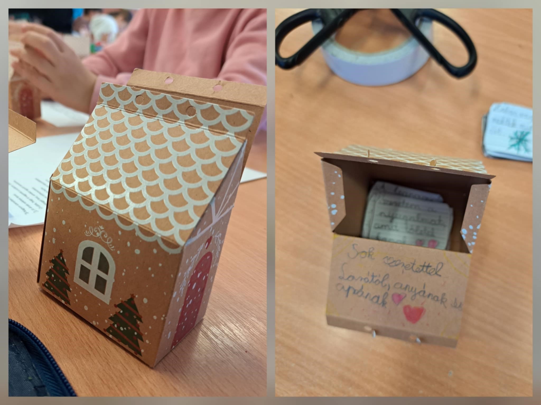 A foglalkozás rövid leírása: November végén kis papírházikóba valamennyi tanulónk 24 db meglepetéskártyát készített családtagjainak. Otthon az ajándékozott (vagy ajándékozottak) minden nap felolvashattak ebből egy gondolatot az adventi időszakban egészen dec. 24-ig.