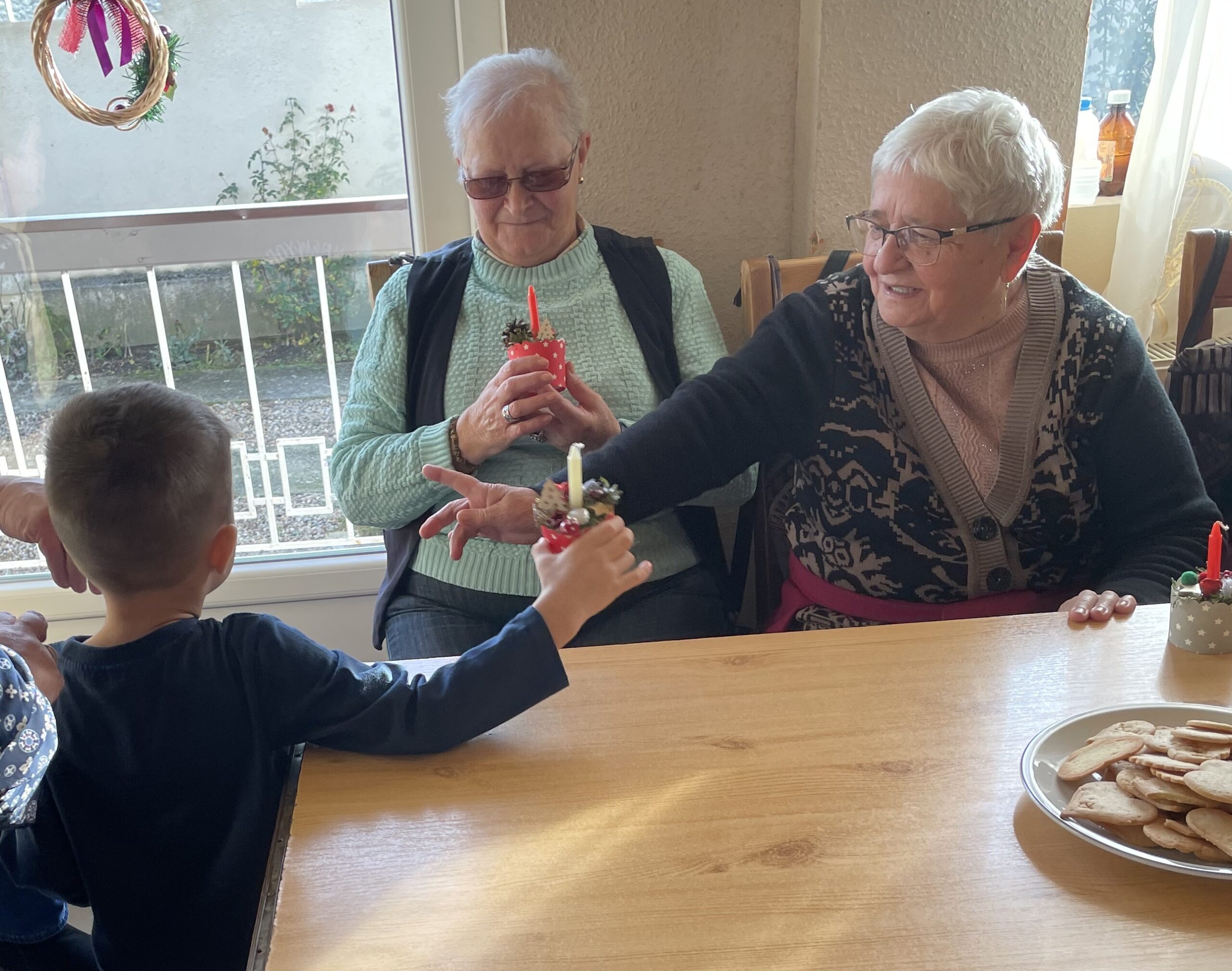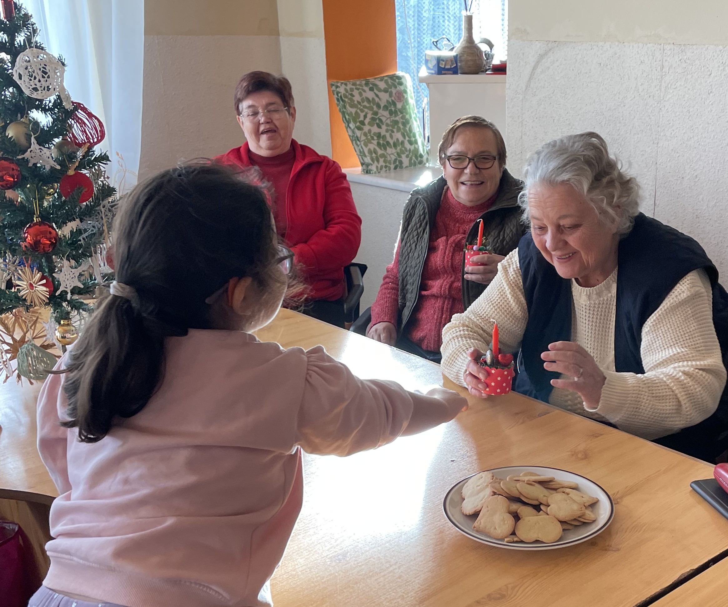 Már hagyománnyá vált a csoportunkba, hogy a közelünkbe lévő idősek napközisotthonába ellátogatunk és a karácsonyi kántálásunk mellé általunk készitett ajándékot is viszünk.Igy volt ez ebben az évbe is amikor gyertyás asztali disszel leptük meg a tiszteletbeli nagymamákat.A gyerekek boldog szivvel készitették el kis ajándékokat és mindegyik asztaldiszbe behelyezték boldogságos piros szivecskéjüket.