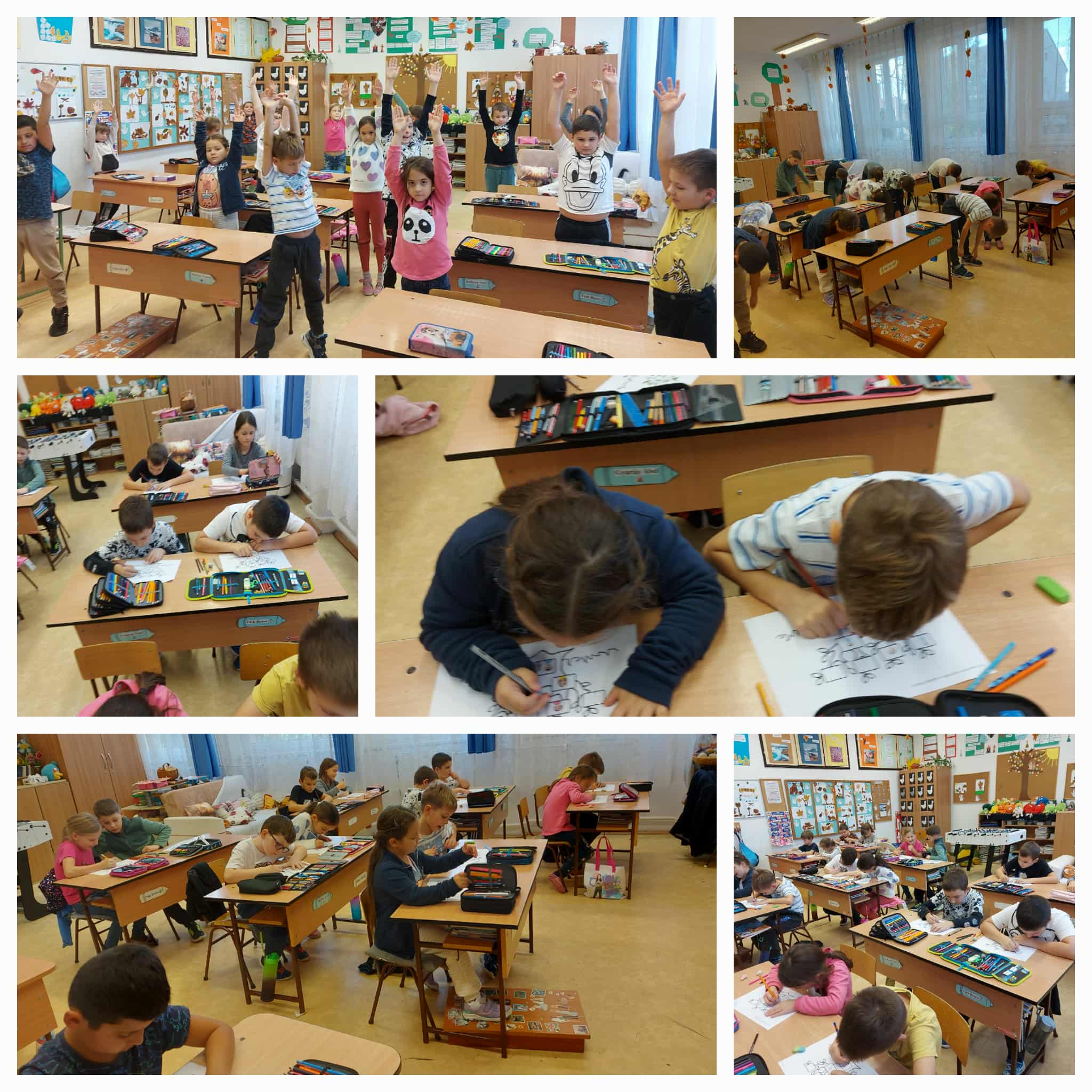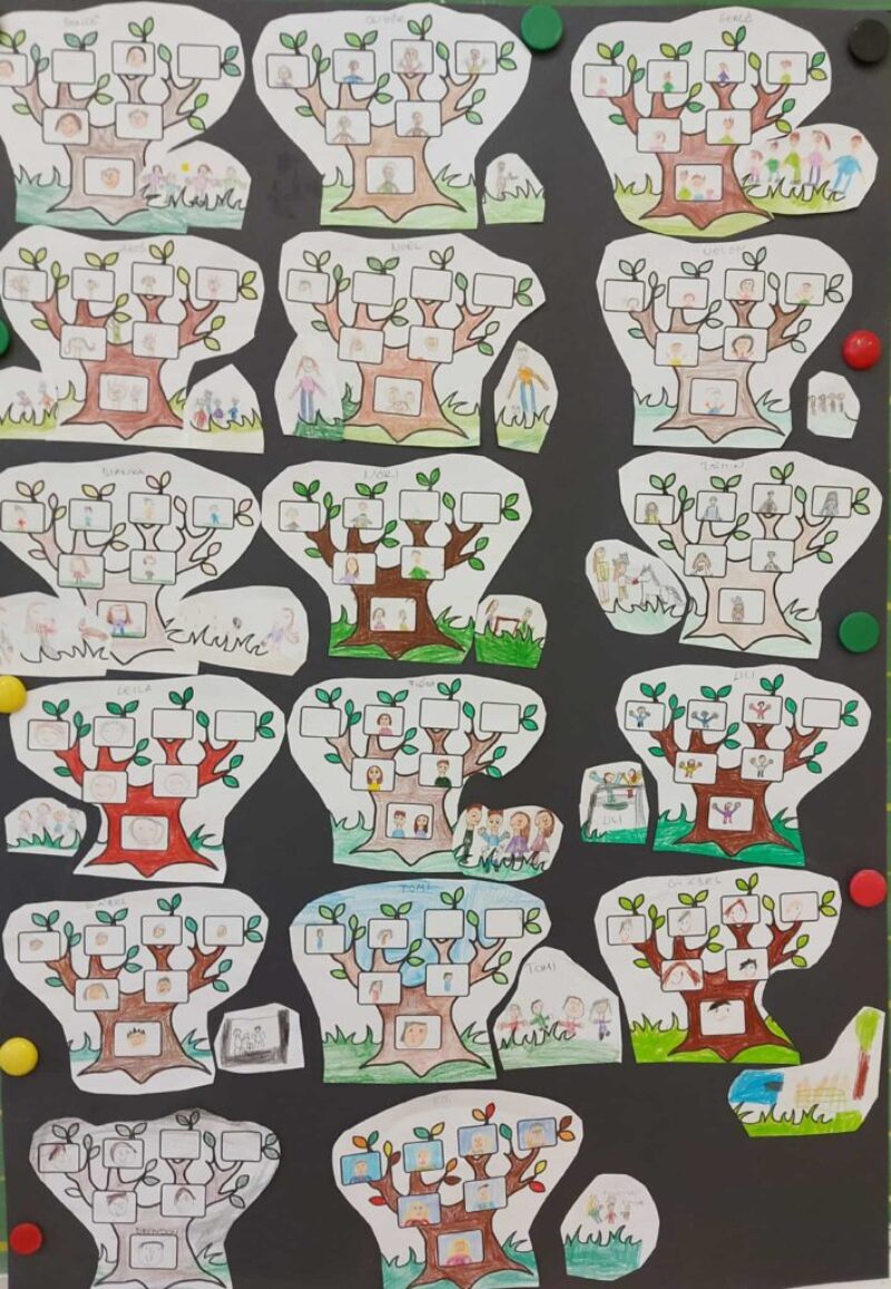 A havi témát több tanítási órán dolgoztuk fel. Az első foglalkozást relaxációs gyakorlattal kezdtük: „Égig érő fa vagyok, megnövök, mint a nagyok…”. Megbeszéltük az elméleti hátteret, közösen összeszedtük, milyen társas kapcsolataik vannak. Aztán elkészítették a családfájukat, berajzolták a szülőket, nagyszülőket. Kiszínezték a képet, és lerajzolták az egyik kedves, a családdal közös élményüket. Közben többször meghallgattuk a hónap dalát. Az első foglalkozást meditációval zártuk.