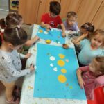 A hét vége felé barátság „tablót” készítettünk a gyermekek kezének körberajzolásával. A tabló kidíszítése közben, megbeszéltük, ki, hogy érzi, vannak e barátai az óvodában/csoportban. Örömmel hallottuk, hogy minden gyermek igennel válaszolt, mosollyal az arcán. Mindenki rávágta, hogy vannak barátai a csoportban, akivel szeret játszani.
