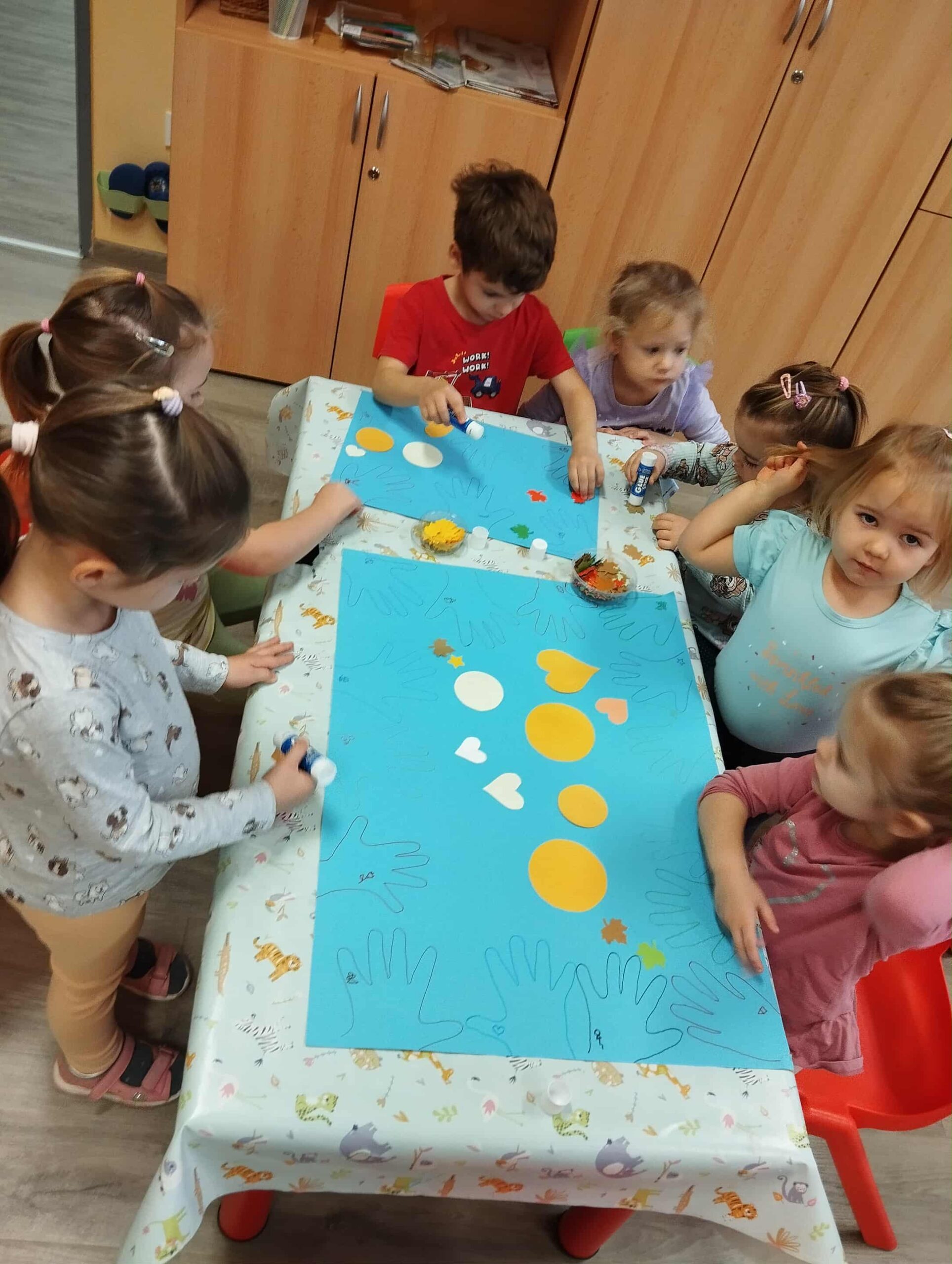 A hét vége felé barátság „tablót” készítettünk a gyermekek kezének körberajzolásával. A tabló kidíszítése közben, megbeszéltük, ki, hogy érzi, vannak e barátai az óvodában/csoportban. Örömmel hallottuk, hogy minden gyermek igennel válaszolt, mosollyal az arcán. Mindenki rávágta, hogy vannak barátai a csoportban, akivel szeret játszani.